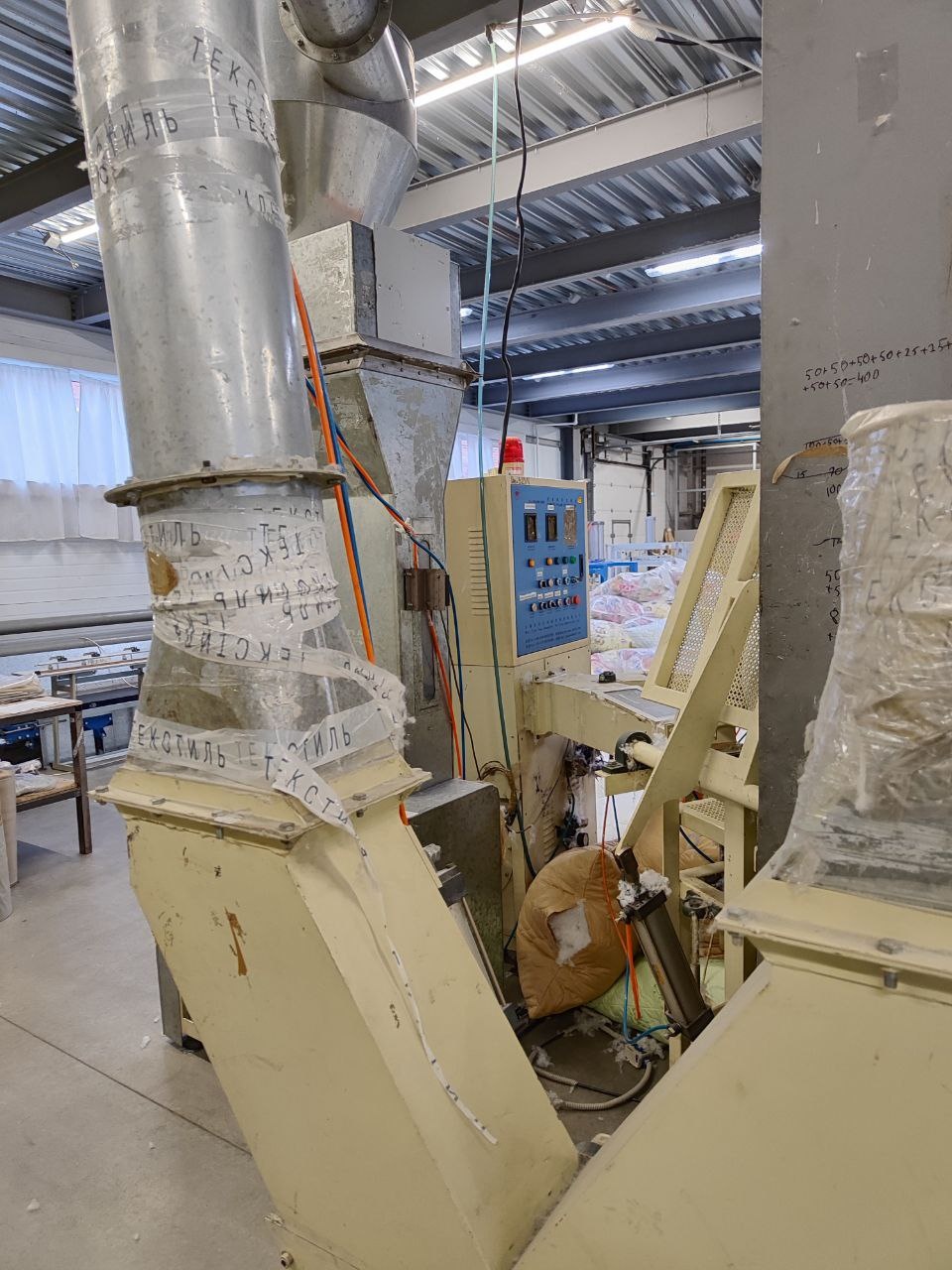 Комплект машины: транспортер для подачи волокна, чесальная машина, электронное управление (микросхема). Два выходных отверстия, позволяют обеспечить полную загрузку линии.