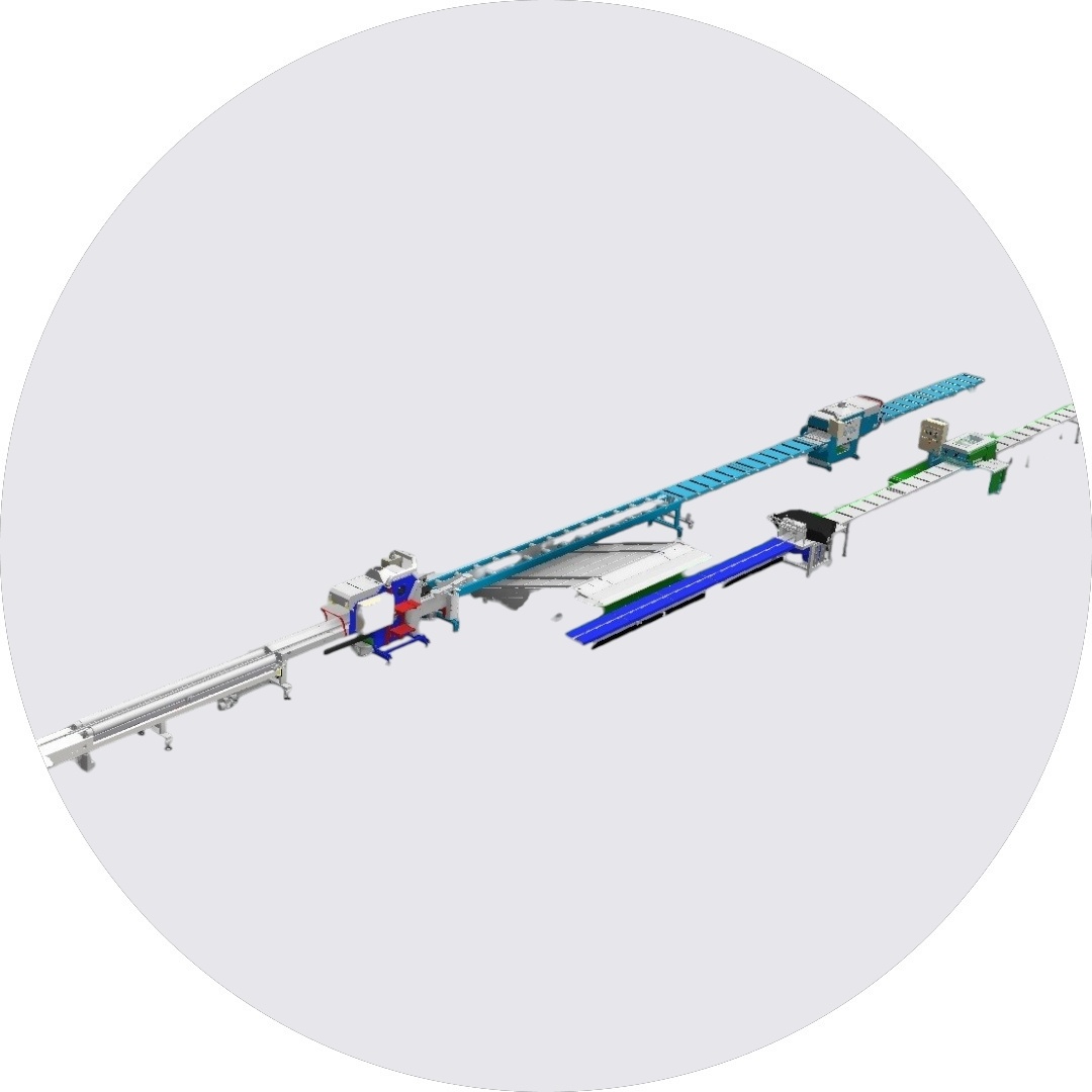 - верстат двосторонній поздовжньо обрізний OWD-4/350 КВА з подаючим столом 6 метрів, та додатковими роликовими столами.