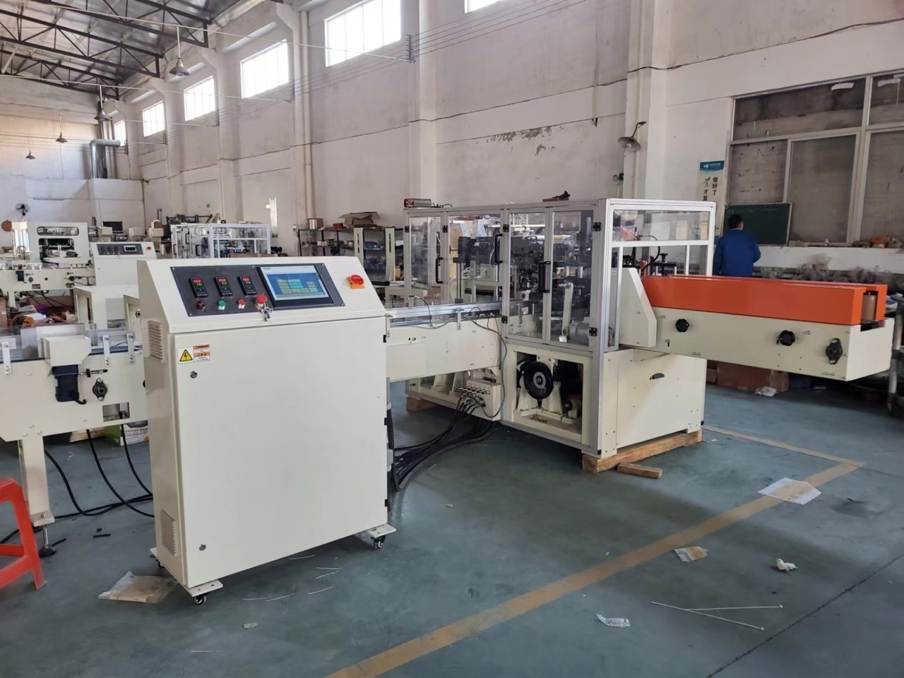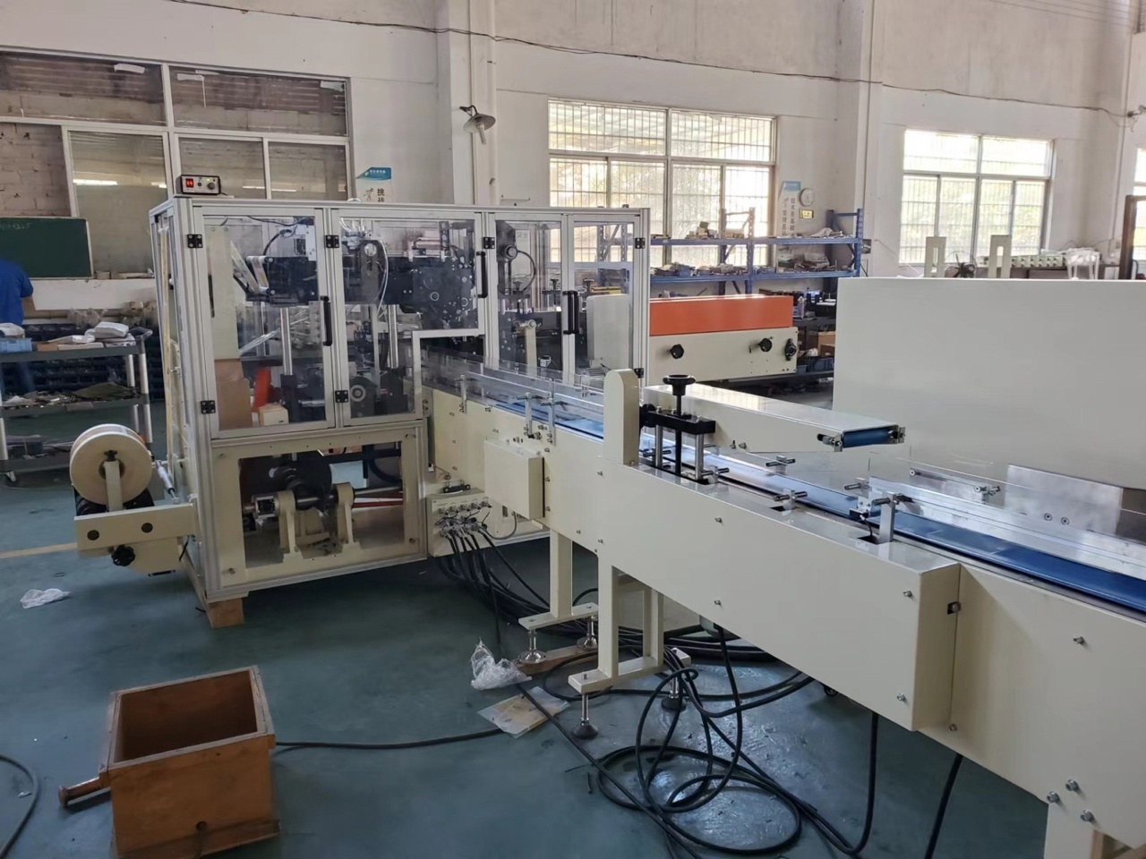Автоматическое упаковочное оборудование для салфеток. Обслуживает 5 салфеточных станков.