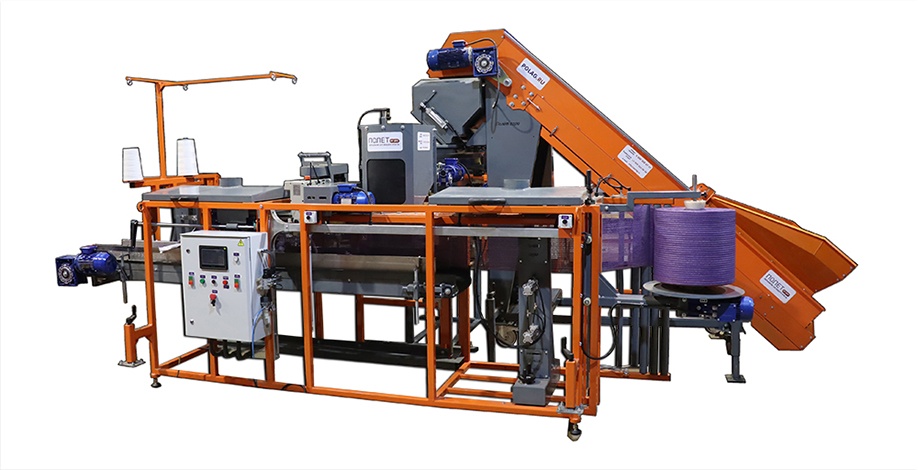При набегании кармана в сетке на датчик положения отверстия последний даёт команду дозатору и сетка через горловину приема продукта загружается взвешенной порцией корнеплодов. Швейная машина зашивает сетку.