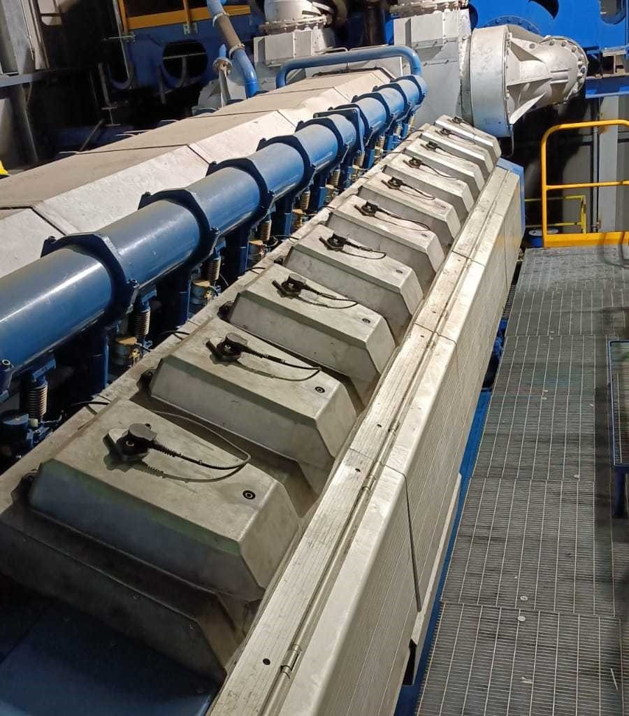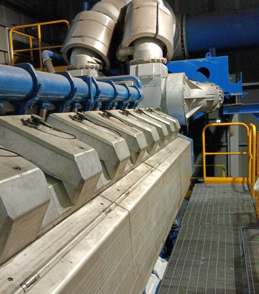Полная установка включает – Двигатель низкооборотистый 750 об/мин, генератор, рама, система управления, газопровод, 2 радиатора, 2 градирни, панели синхронизации, распределительное устройство, трансформатор 6000 В/20 000 В.