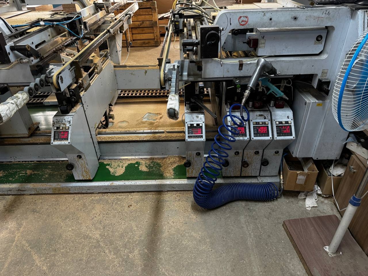 5 вертикальных суппортов с двумя сверлильными агрегатами снизу с моторами по 1,5 кВт, 3000 об/мин