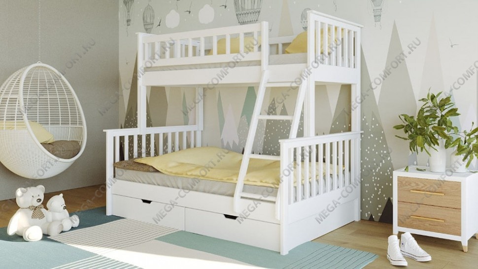 Двухъярусная кровать из массива сосны с тремя спальными местами. Такая мебель заметно экономит место в небольших по площади квартирах. Доставка по Москве бесплатная. Сборка в день доставки. https://mega-comfort.ru/krovati/dvukhyarusnaya-krovat-barselona