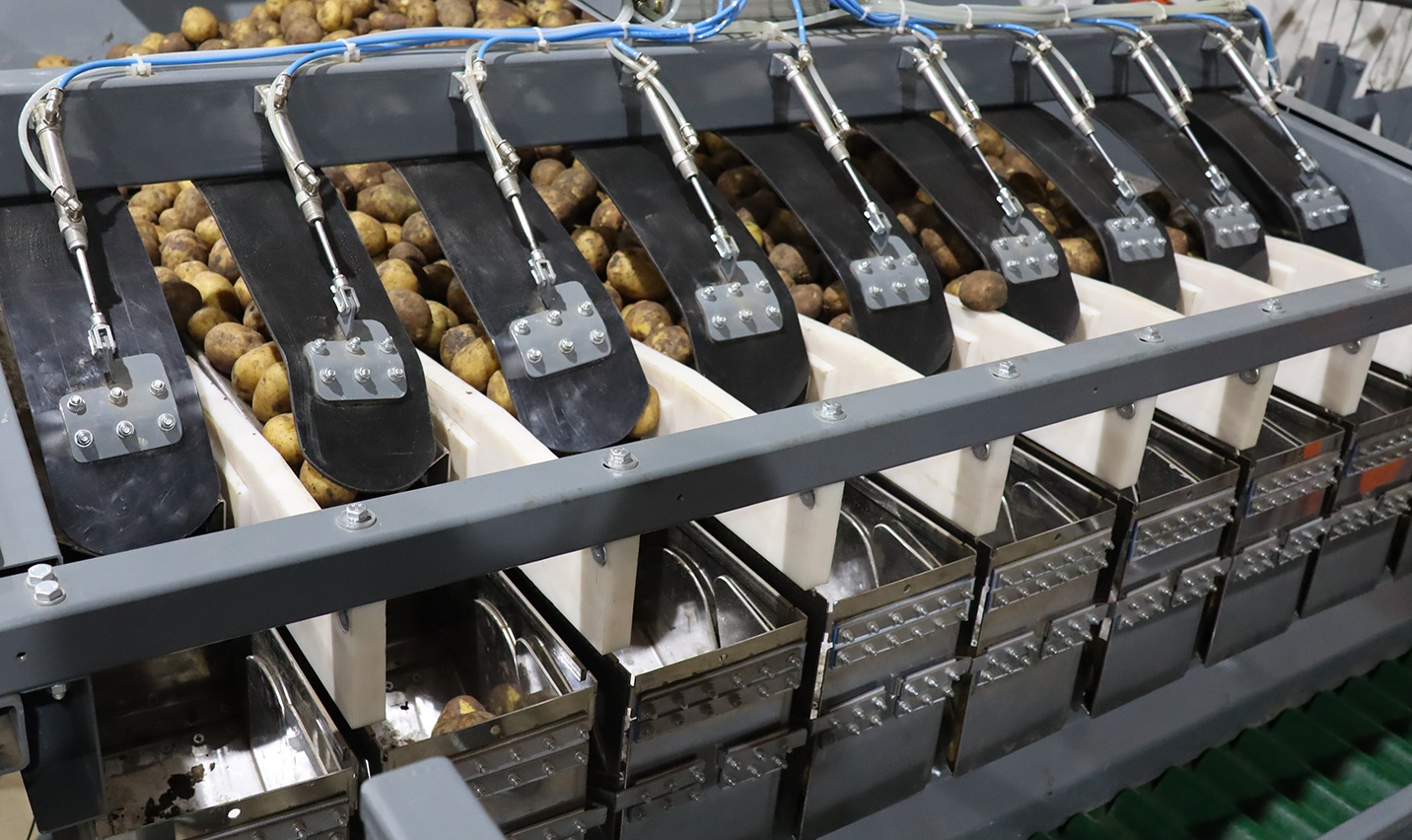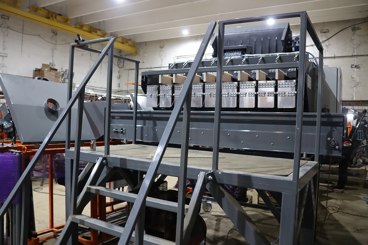 После подбора нужных чаш, контроллер подает сигнал на открытие и выгрузку порядка 4-6 чаш. Продукт выгружается на отводящий ленточный транспортер, который подает продукт в упаковочную машину. Далее цикл повторяется, но уже набираются только пустые чаши.
