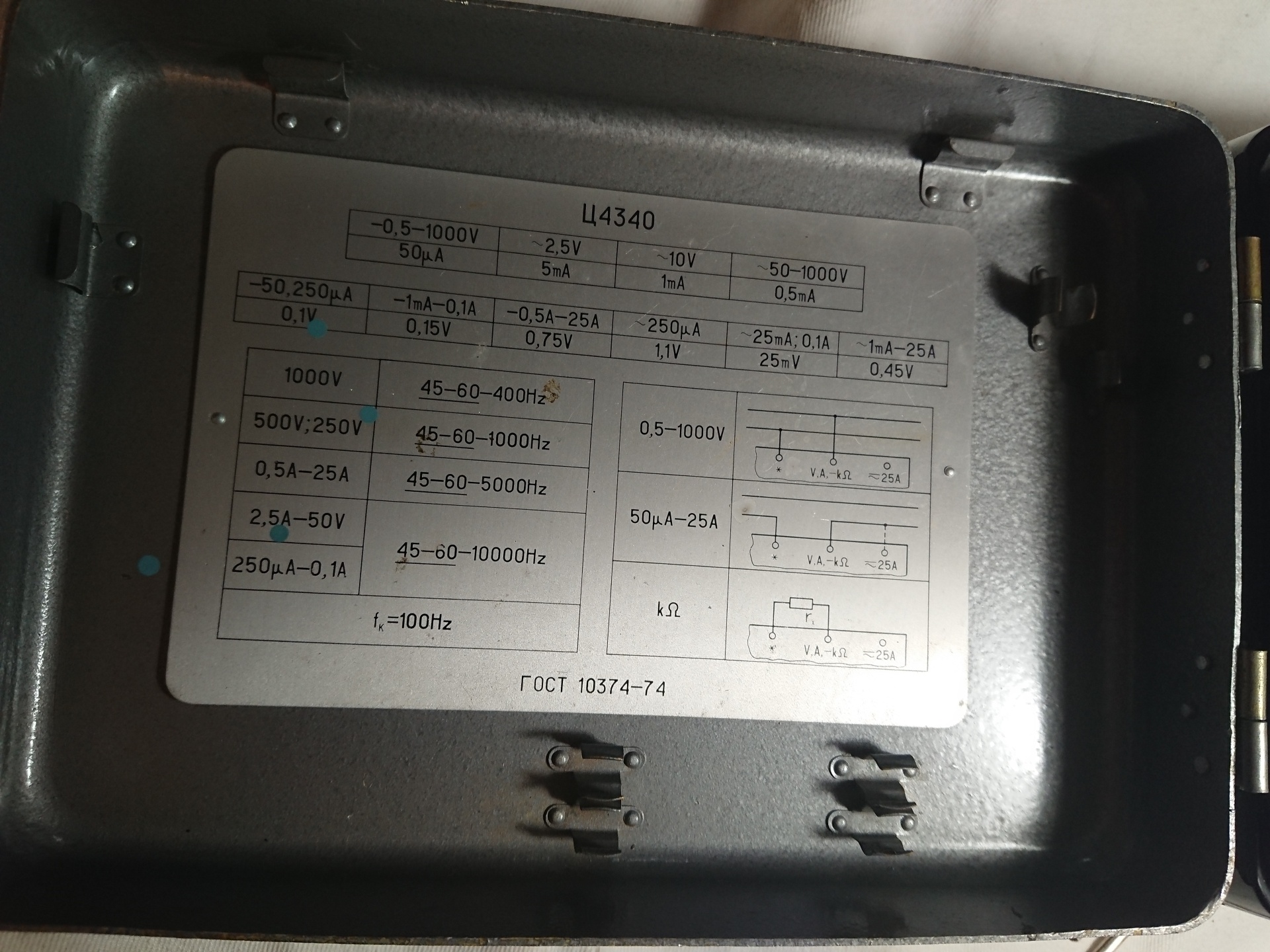 Тестер Ц4340 имеет магнитоэлектрический измерительный механизм на растяжках ПлСр.М-0,36 при натяжении 40г с внутрирамочным магнитом. Ток полного отклонения 50мкА. Рамка тестера Ц4340 содержит 500 витков провода ПЭВ-1 0,03.