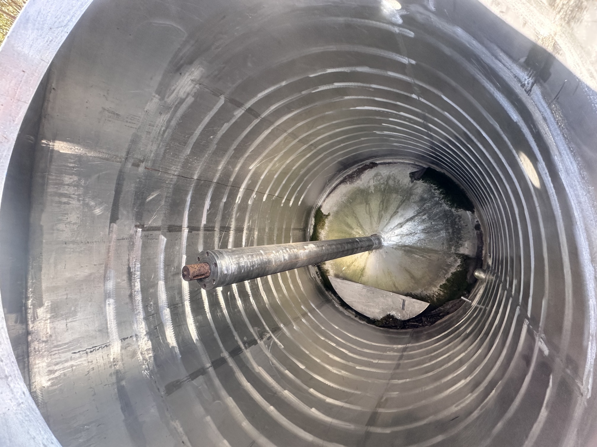 Нержавеющая емкость с рубашкой. Объем 5 м3. Высота 3500, диаметр 2000. Диаметр люка 595