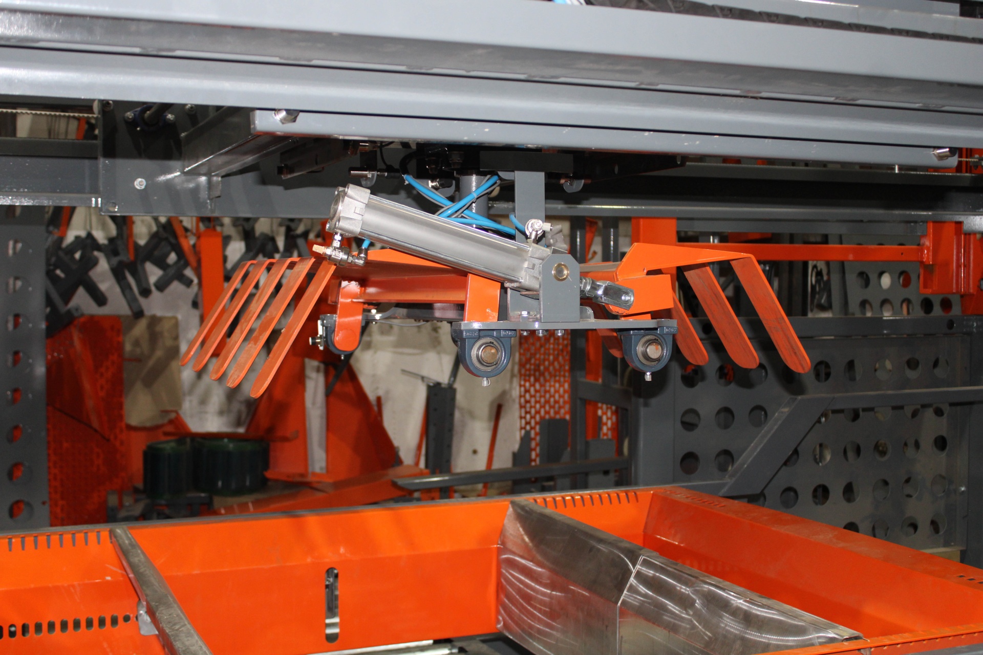 С роликового конвейера упаковка подхватывается специальными вилами, которые быстро и бережно приподнимают мешок/пакет для его передачи в захват клещевого типа.