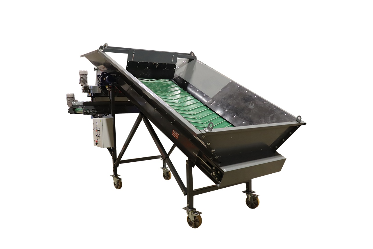 Продукт подается бункер и по широкой транспортерной ленте с регулируемой скоростью, подается дальше на линию переработки. Ворохоотделитель из 6 вращающихся валов с резиновыми звездочками очищает овощи от мелочи, мусора, земли и камней, которые проваливаются между валами и попадают на отводящий транспортер.