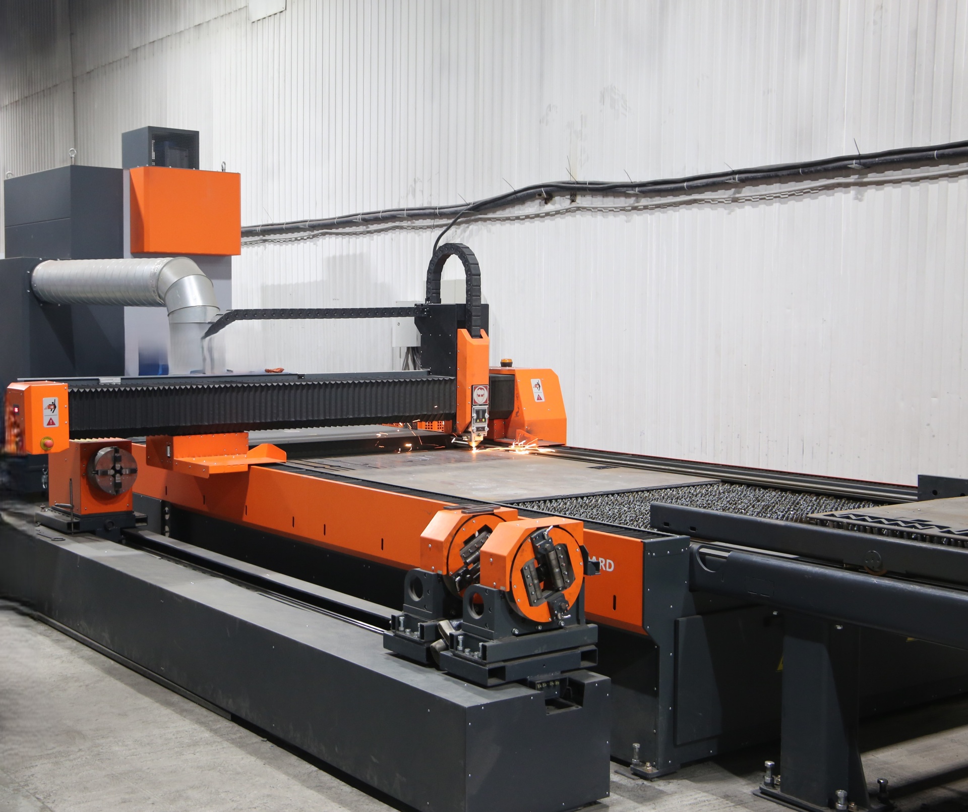 В комплекте автоматизированный челночный стол с разными уровнями рабочих паллет, модуль резки круглой и профильной труб TCM-Professional, ФВУ (фильтровентиляционная установка) на 8000 куб.м./час, нагнетатель давления до 16 бар (при резке на воздухе).