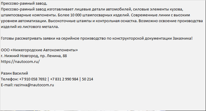 | Прессово-рамный завод. Прессово-рамный завод изготавливает лицевые детали автомобилей, силовые элементы кузова, штампосварные компоненты. Более 10 000 штампосварных изделий. Современные линии с высоким уровнем автоматизации. Высокоточные штампы и контрольная оснастка. Возможно освоение производства изделий из листового металла. Готовы рассматривать заявки на серийное производство по конструкторской документации Заказчика! ООО «Нижегородские Автокомпоненты» г. Нижний Новгород, пр. Ленина, 88 https://nautocom.ru/ Разин Василий Телефон: +7 910 058 7692 | +7 831 2 990 984 | 50 214 E-mail: razinva@nautocom.ru |
