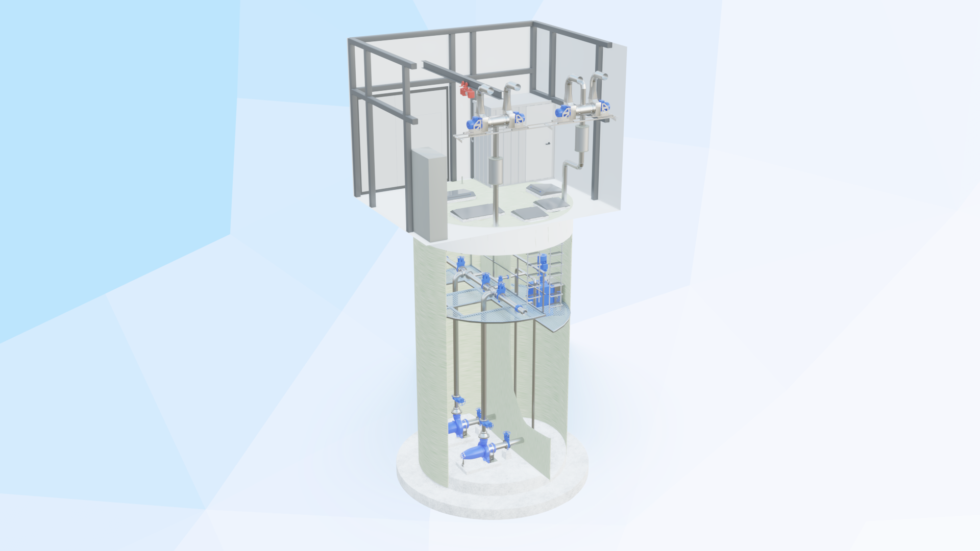 - Компоновка и обвязка оборудования обеспечивает возможность замены агрегатов, арматуры и отдельных узлов без остановки работы станции (п.8.2.1. СП 32.13330.2012 Канализация. Наружные сети и сооружения).