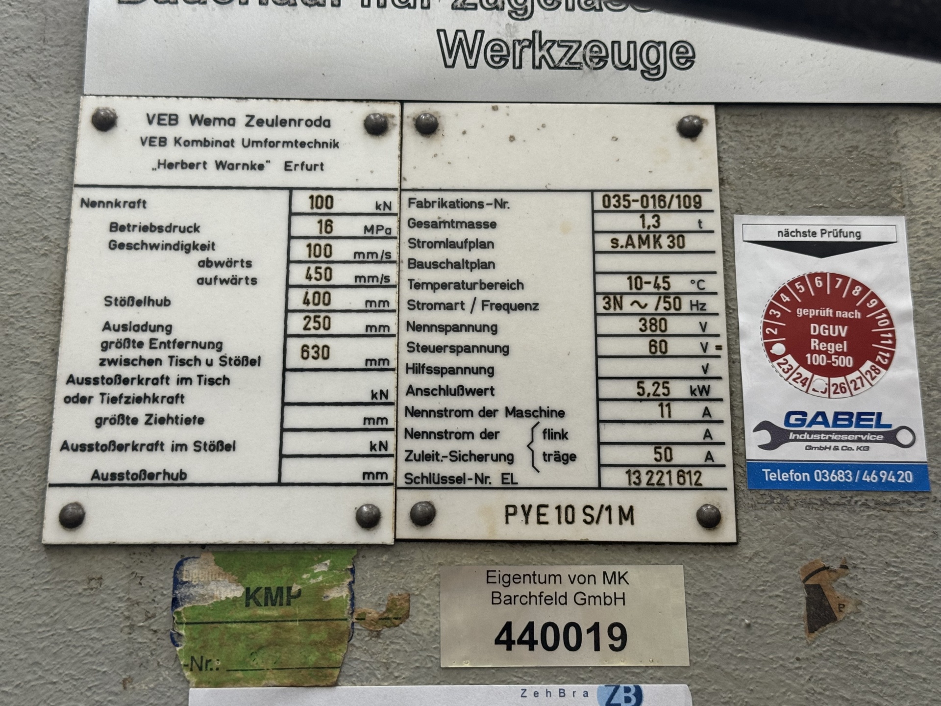 Гидравлический пресс WMW Zeulenroda - PYE 10 S1M Б/У - Продам в Zevenaar
