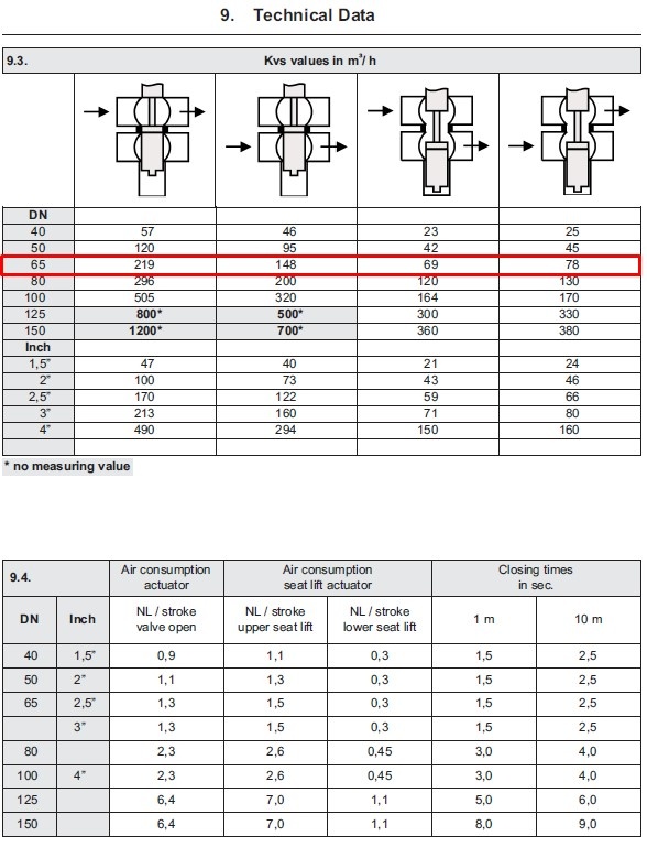 Показатель KVS (объем расхода воды через полностью открытый регулирующий клапан в м3/час при перепаде давлений 1 Бар при нормальных условиях): от 69 до 219 куб.м / час, в зависимости от траектории (см. схему).