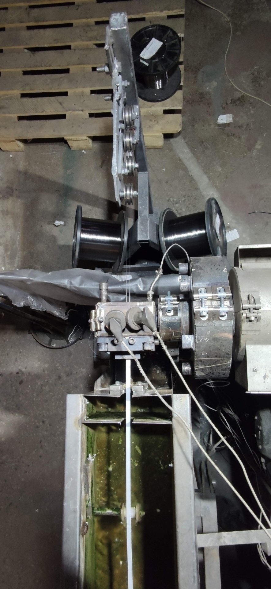 В комплект оборудования входит: одношнековый экструдер для полимеров SJ 45 2014 года выпуска, отдаточный узел с роликами для выравнивания проволоки, ванна охлаждения с насосом и емкостью для хранения воды, тянущее устройство колесного типа и двух постовая намоточная машина, а так-же вспомогательное оборудование: две перемоточные машины для перемотки проволоки с бухты на катушку.