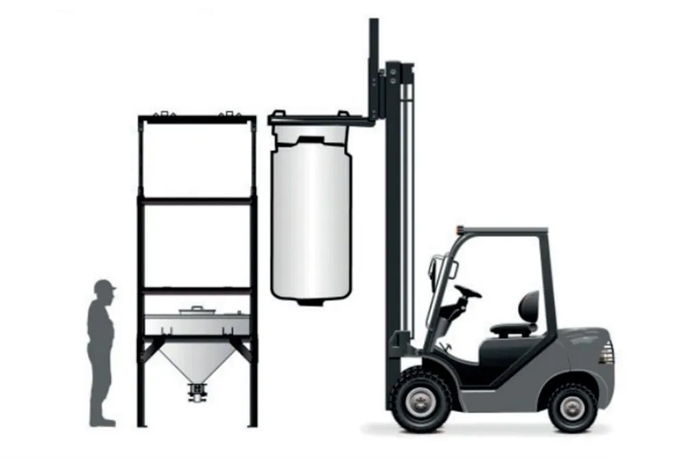 Биг-бег с помощью вилочного погрузчика, кран-балки или электрического тельфера подвешивается на раме, оператор вскрывает его и ссыпает содержимое в бункер. Для плохо сыпучих материалов станция растаривания биг-бэгов может оснащаться устройством разрушения сводообразований в накопительном бункере.