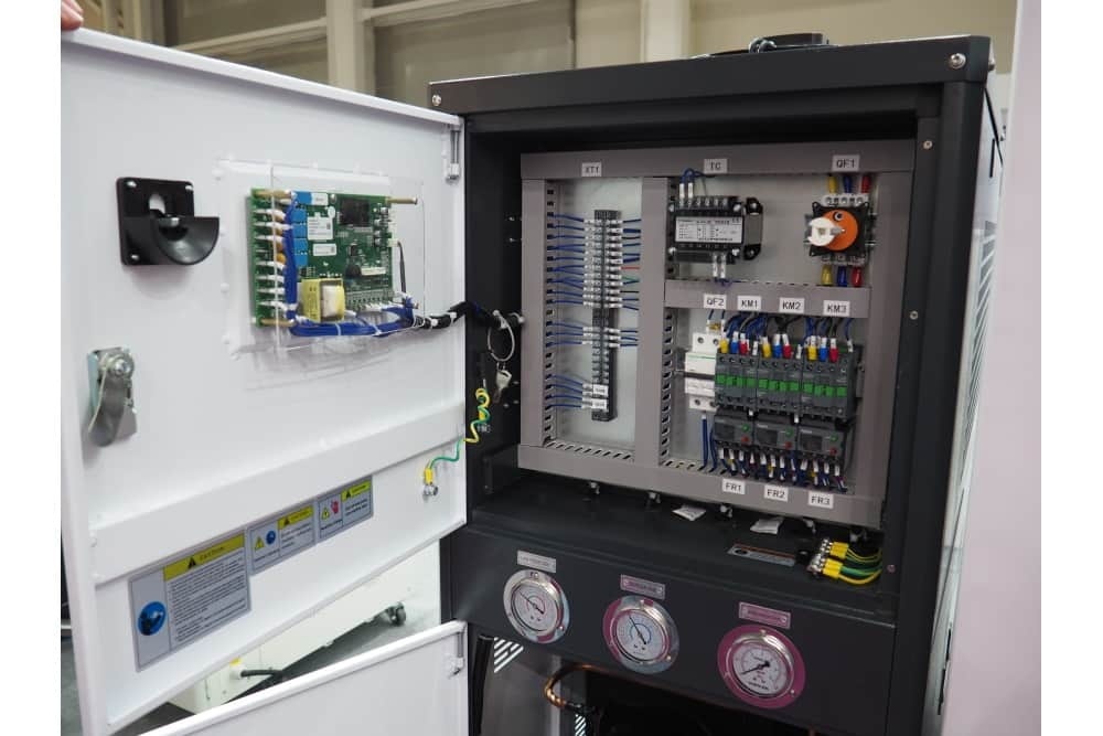 Бак для воды и трубопровод, выполненные из нержавеющей стали, а также все трубопроводы имеют теплоизоляционное покрытие. Вентиляционные отверстия охлаждения конденсатора оборудованы фильтрами для очистки поступающего воздуха. Компрессор: типа COPELAND (Германия) с хладагентом R407C. Помпа: типа Nanfang (Тайвань), выполнена из нержавеющей стали, рабочее давление 4 атм., подходит для использования на протяженных магистралях. Чиллер для термопластавтомата PIC-A оснащен защитными кожухами, что позволяет проводить безинструментальное обслуживание.