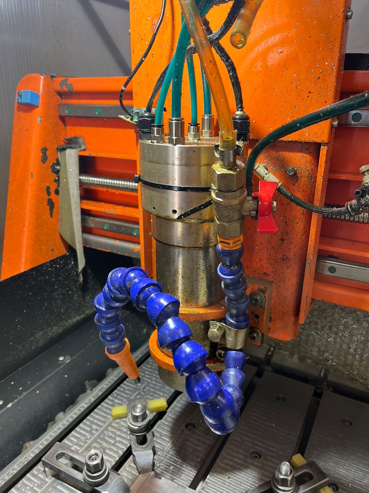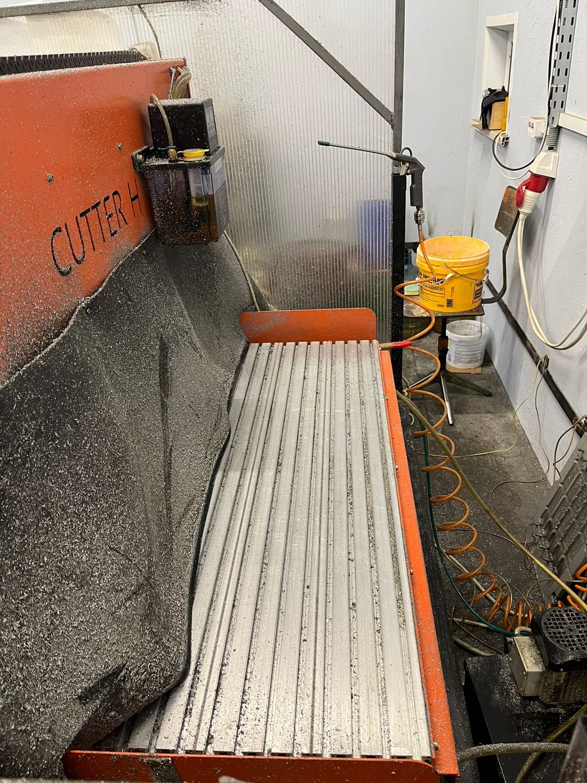 Установлен более жесткий и тяжелый стол, за счет применения мощных двутавровых балок. Станок меньше вибрирует при перемещении и во время резки, а стол будем меньше прогибаться по высоте.