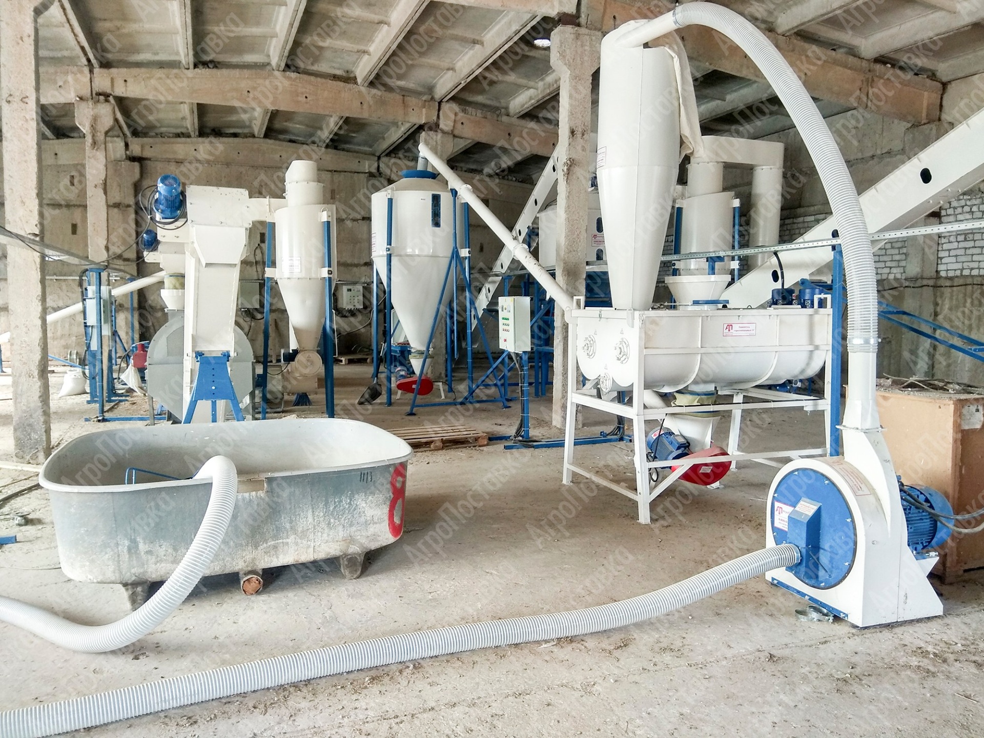 зерно, по гибкому шлангу, поступает в дробилку. На входе в дробильную камеру установлен сепаратор, который отделяет от зерна камни и металлические примеси. После измельчения продукт попадает в накопитель, дозируется и отгружается в смеситель. Накопитель устанавливается на весах со встроенным звуковым сигналом, что позволяет точно отмерять каждый компонент. Смеситель снабжен независимым бункером для компонентов, не требующих дробления (отруби, премиксы). Выгрузка готового продукта осуществляется шнеком через нижний люк.