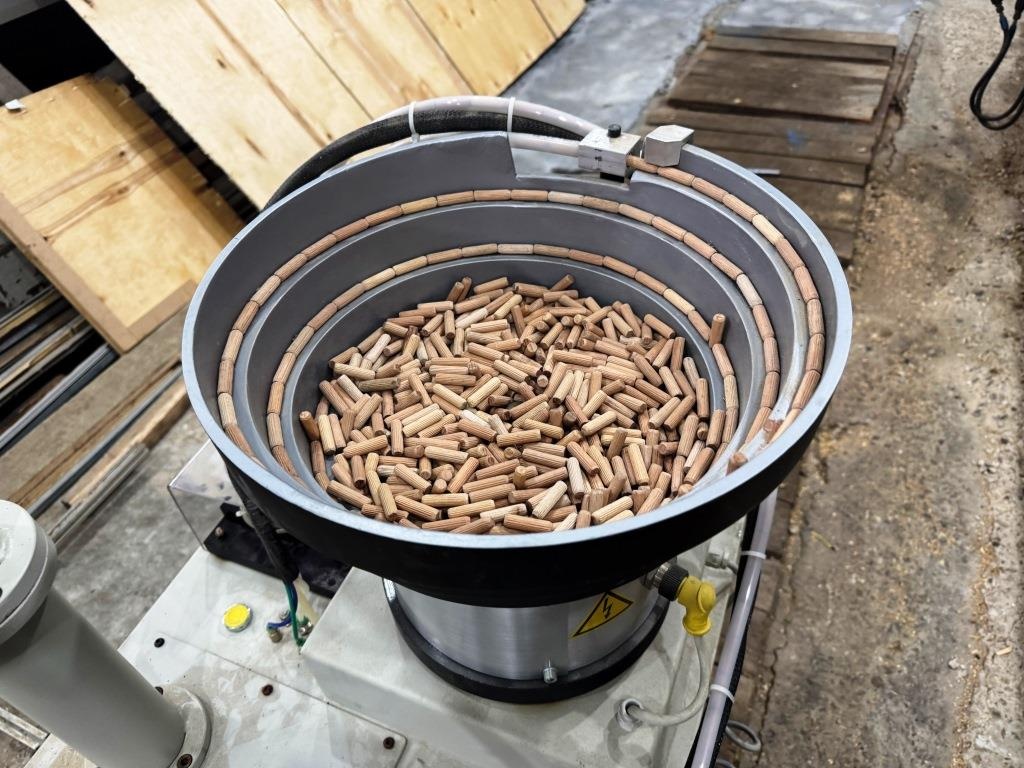 Полуавтоматический шкантонабивной станок с автоматической подачей шкантов и клея. Предназначен для установки шкантов на клей с помощью пневмопистолета со шкантоводом в сборочные отверстия на мебельных деталях.