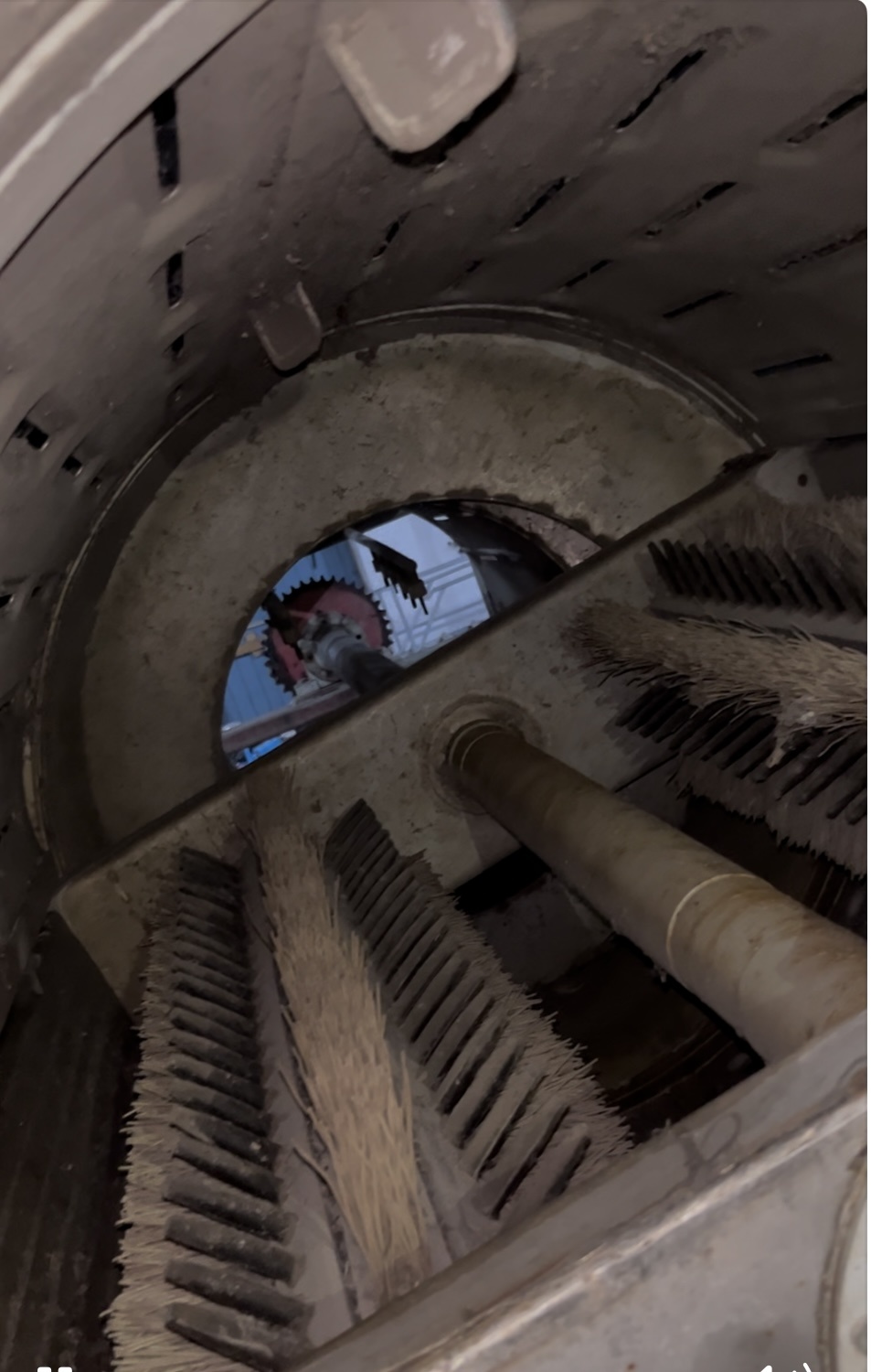 Секция щеточной мойки - цилиндр из перфорированных сегментов, собранных на уголковом каркасе. В расточках лопастей расположены два щеточных блока, состоящих из колодок щеточных и с резиновыми пальцами, на полуцилиндрических обоймах. На каркасе шарнирно закреплены два неподвижных щеточных блока.