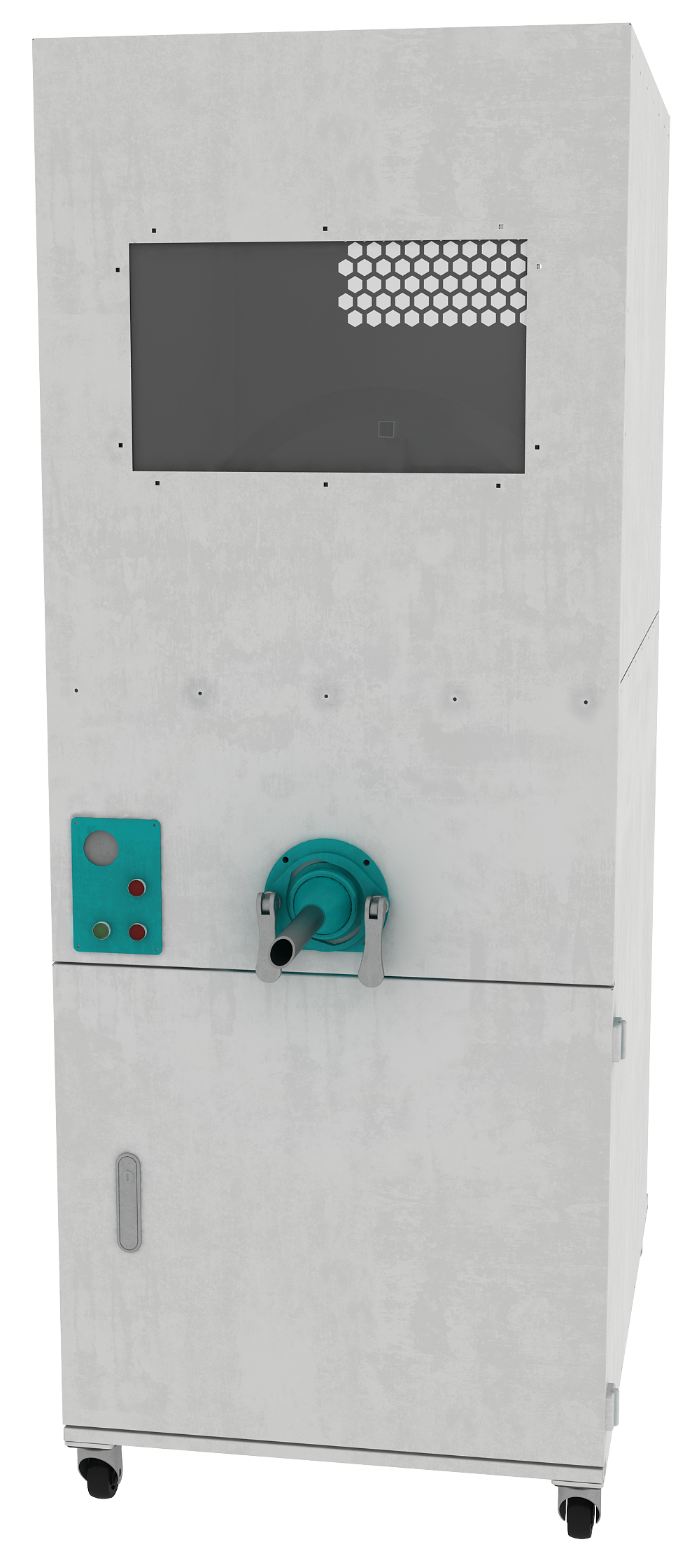 Устройство и принцип работы: - Изделие выполнено в виде короба на роликовых колёсах, что облегчает его перемещение по производственному участку. Всасывающий пневмотранспорт транспортирует набивочный материал с атмосферным воздухом по трубопроводу, далее он поступает через входной патрубок, расположенный в верхней части корпуса, во внутреннюю полость камеры изделия. Процессы, происходящие в камере изделия можно отслеживать через прозрачный экран. В камере, для достижения однородности и равномерной подачи материала в зону выдува, посредством мешалки происходит перемешивание. Далее под воздействием потока воздуха материал подаётся к выходному отверстию. С внешней стороны к этому отверстию могут быть присоединены насадки ( с патрубками различного диаметра), для заполнения швейных изделий различного объёма.