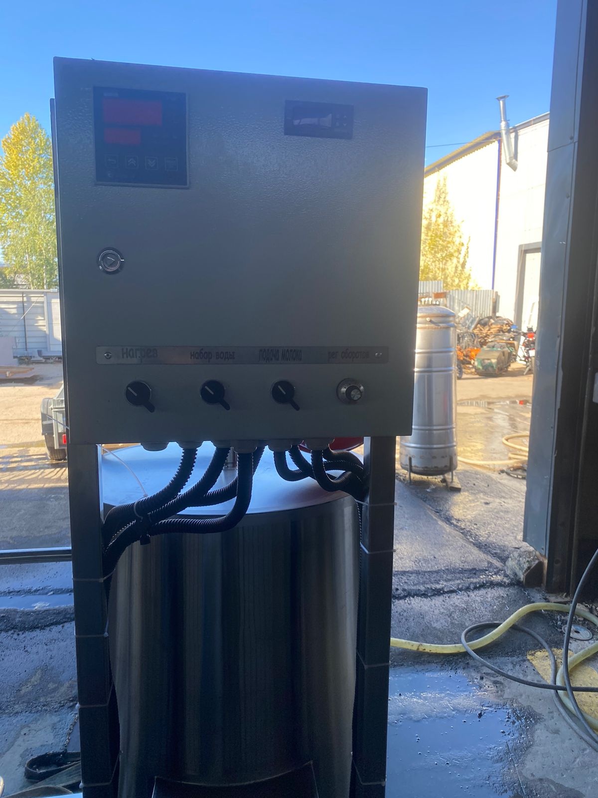 За весь нагрев отвечает автоматика, которая отслеживает температуру воды и температуру молока, входящего и выходящего.