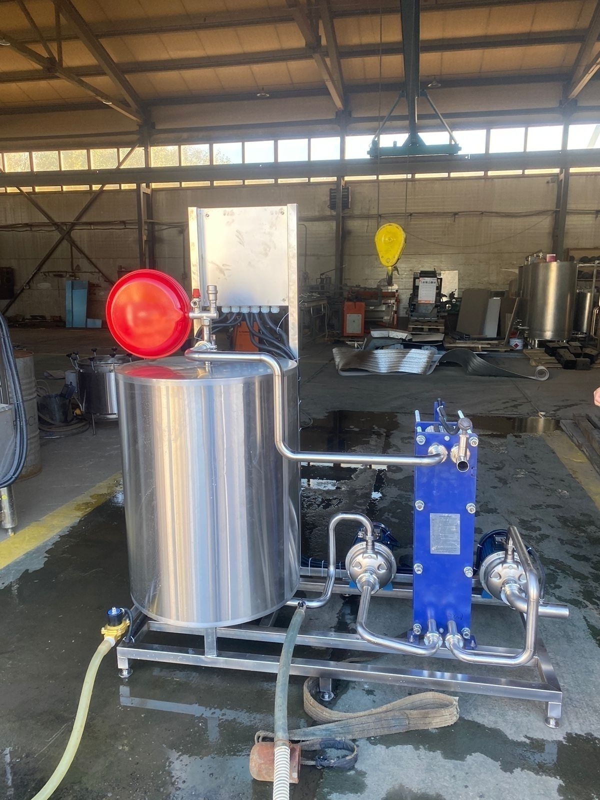 В пластинчатом теплообменнике происходит, нагрев молока до необходимой температуры за счет горячей воды.