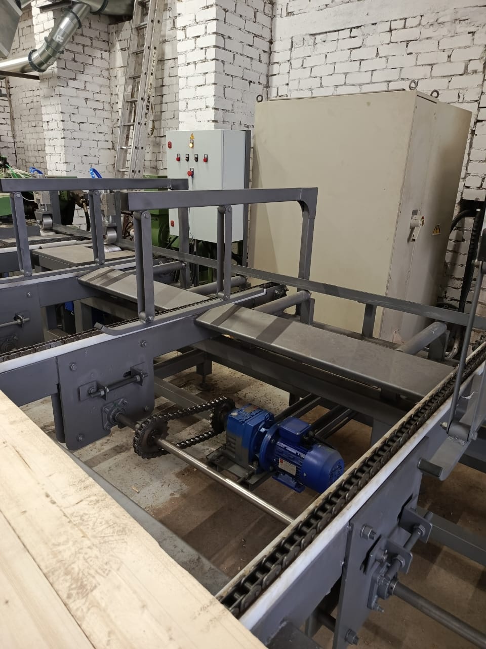 За счет более низкой скорости движения транспортера, на нем образуется буфер заготовок и возможность их дефектовки. По заполнению буфера заготовки автоматически подхватываются роликами разгонного модуля и разгоняются до скорости работы строгального станка.