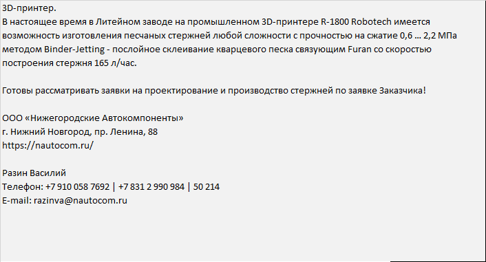 | 3D-принтер. В настоящее время в Литейном заводе на промышленном 3D-принтере R-1800 Robotech имеется возможность изготовления песчаных стержней любой сложности с прочностью на сжатие 0,6 … 2,2 МПа методом Binder-Jetting - послойное склеивание кварцевого песка связующим Furan со скоростью построения стержня 165 л/час. Готовы рассматривать заявки на проектирование и производство стержней по заявке Заказчика! ООО «Нижегородские Автокомпоненты» г. Нижний Новгород, пр. Ленина, 88 https://nautocom.ru/ Разин Василий Телефон: +7 910 058 7692 | +7 831 2 990 984 | 50 214 E-mail: razinva@nautocom.ru |