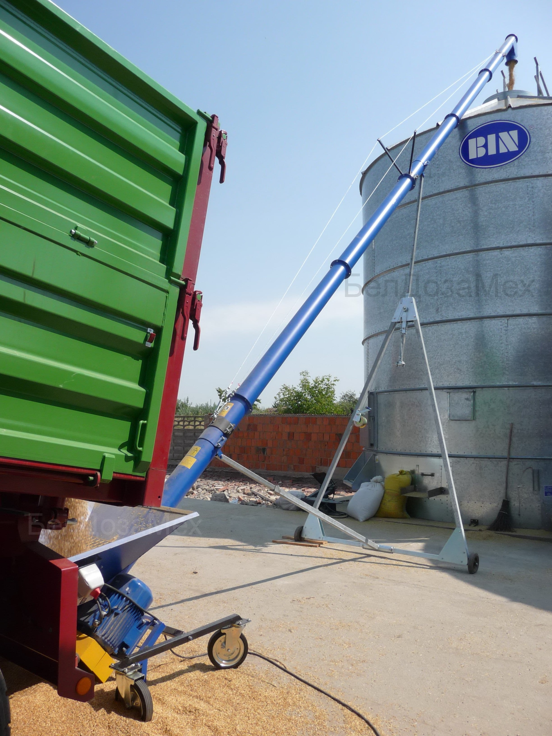 Транспортер шнековый передвижной (на колесах).ТСШ предназначены для транспортировки зерна и схожих по характеристикам материалов (комбикорма, отрубей и т.п.) в горизонтальном или наклонном направлениях. Перемещение продукта происходит в закрытом жёлобе шнекового транспортёра вдоль оси спирального вала. Шнековые транспортеры находят применение при организации погрузо-разгрузочных работ, а также в качестве межоперационного транспорта в комбикормовых производствах, зернохранилищах и зерноочистительных сооружениях.