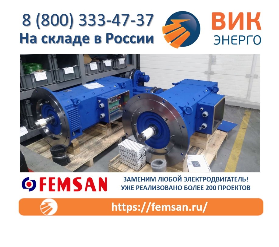Промышленные электродвигатели постоянного тока Femsan имеют мощность 400 кВт, высота оси составляет от 70 до 250 мм. Простота управления и плавная регулировка скорости вращения вала, превосходные динамические показатели. По надежности электродвигатели постоянного тока не уступают асинхронным электродвигателям, средний срок эксплуатации составляет 8-10 лет.