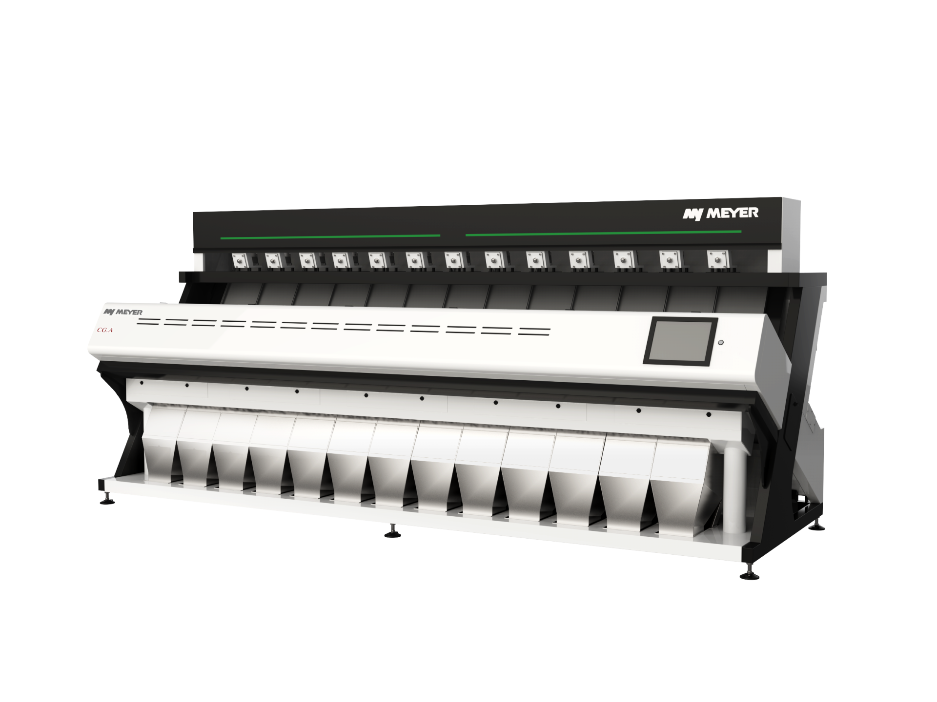 - CG.A (от 2 до 13 лотков) – для работы с большинством типов зерновых и зернобобовых в любых объёмах, а также обладает возможностью установки ИК-сканера для более глубокой сортировки продукта;