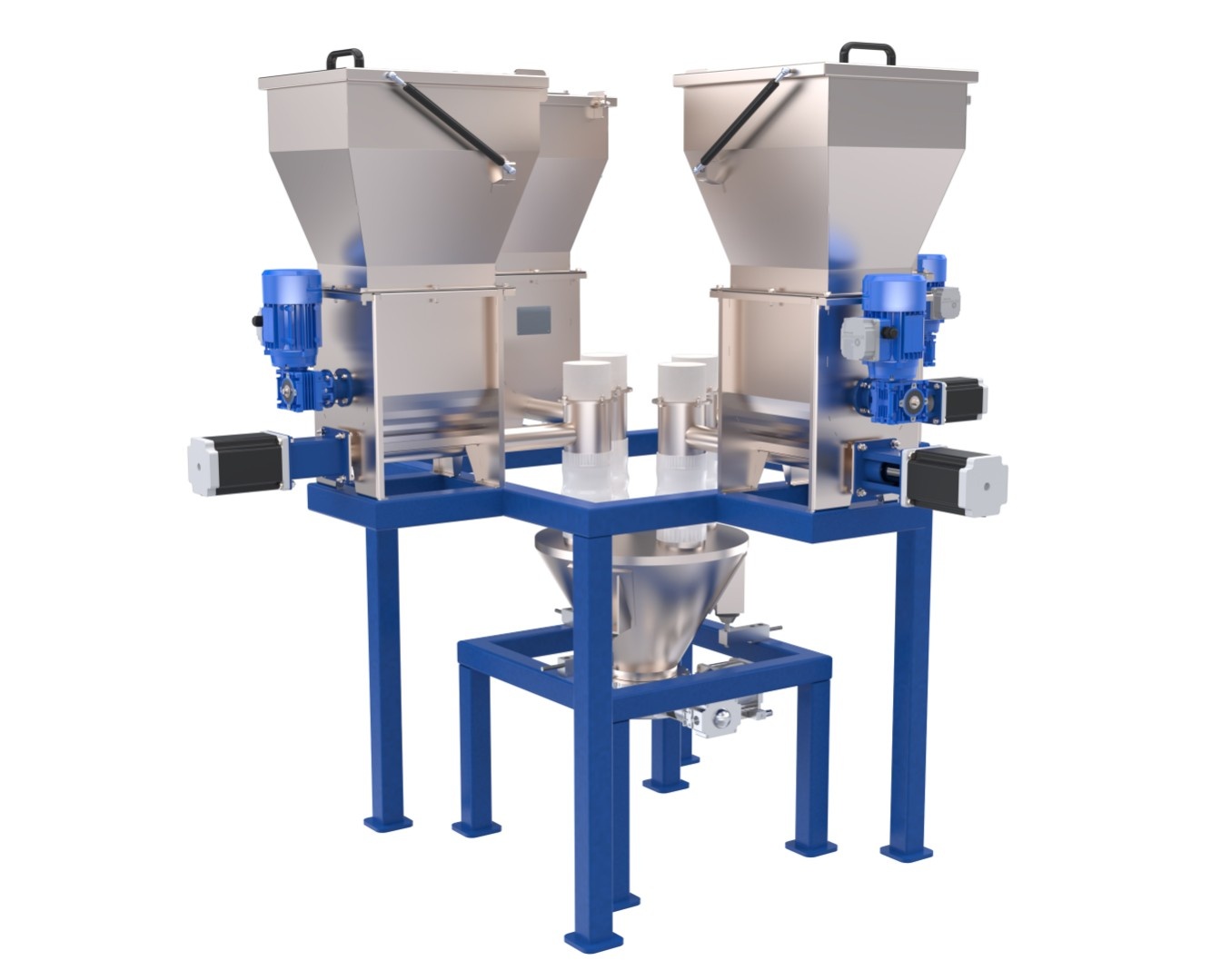 Микродозатор состоит из объемных дозаторов объемом 19л, весового дозатор (объем подбирается согласно ТЗ заказчика) и шкафа управления. Все эти агрегаты закрепляются на опорной раме. В составе узла может быть от двух до восьми объемных дозаторов в зависимости от количества компонентов, используемых при производстве конкретной смеси.