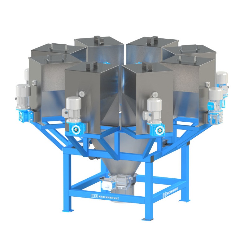 Узел дозирования микродобавок состоит из весового дозатора объемом от 0, 01 до 0, 2 м3 и системы управления. Все эти агрегаты закрепляются на опорной раме. В составе узла может быть от двух до восьми ШДМД в зависимости от количества микрокомпонентов, используемых при производстве конкретной смеси.