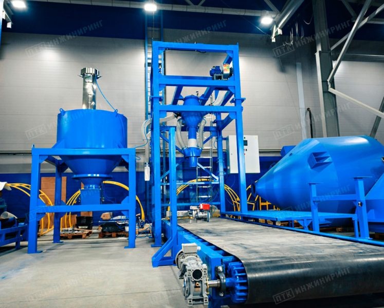 Затариватель биг-бэгов СЗБ Б состоит из накопительного конвейера, бункера-дозатора с пневматическим затвором, промежуточного бункера, узла загрузки с подключенным к нему системы наддува мешка и выходом для подключения к системе обеспыливания.