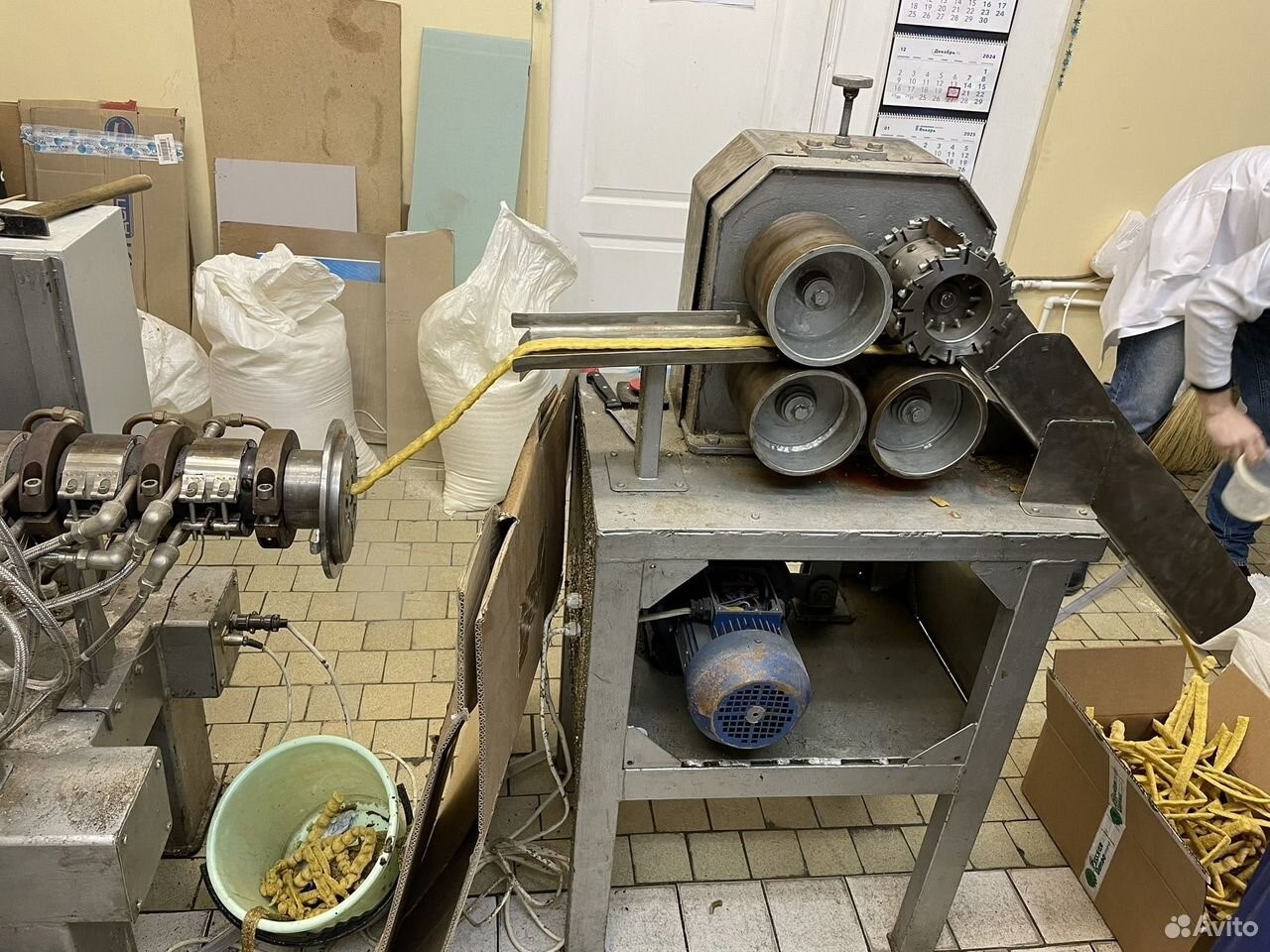 Имеется дополнительный валковый узел для производства хлебцев. Дополнительно имеется набор фильер из нерж. стали с разным диаметром отверстий, новые.
