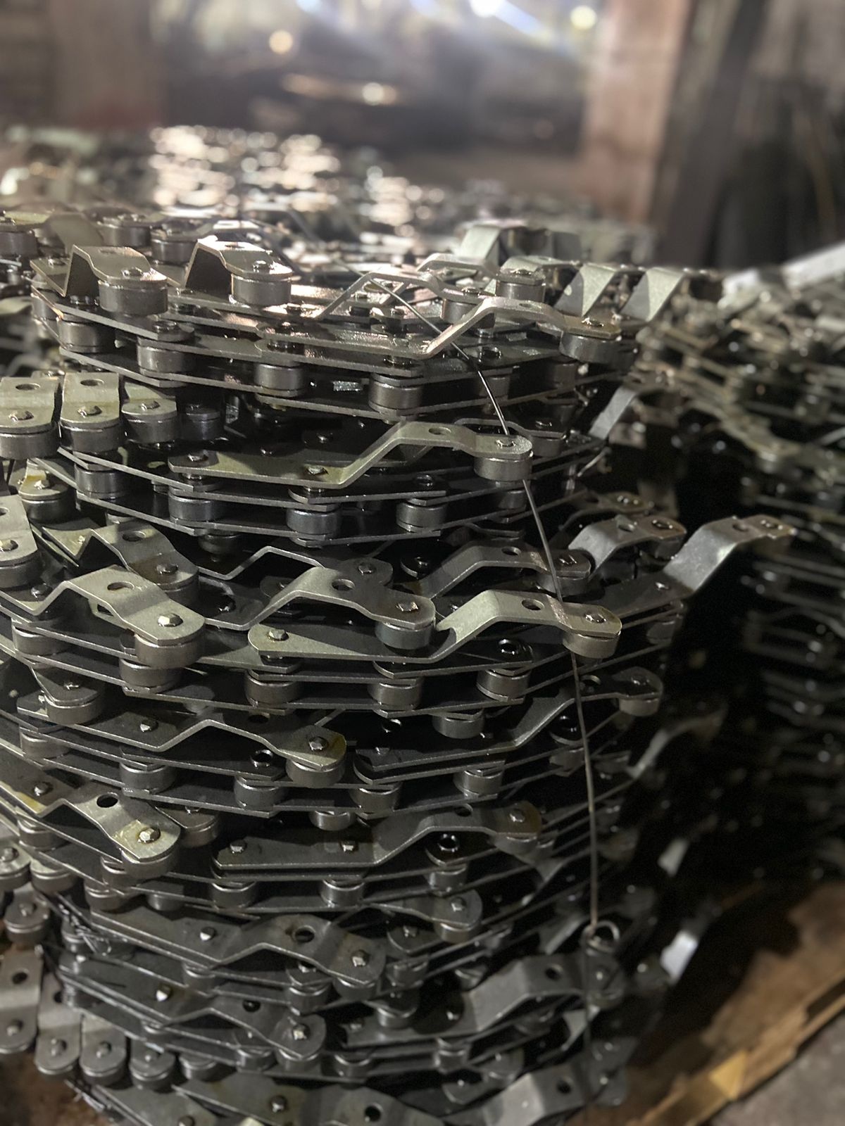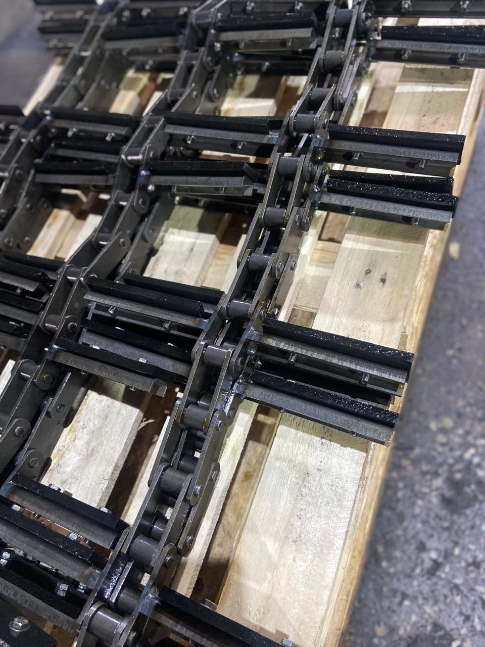 Тяговые пластинчатые цепи применяются в подъемно-транспортных машинах и других механизмах. Изготавливаются как без пластин, так и со спецпластинами типа 1 (втулочные), типа 2 (роликовые), типа 3 (катковые), типа 4 (катковые с ребордой).