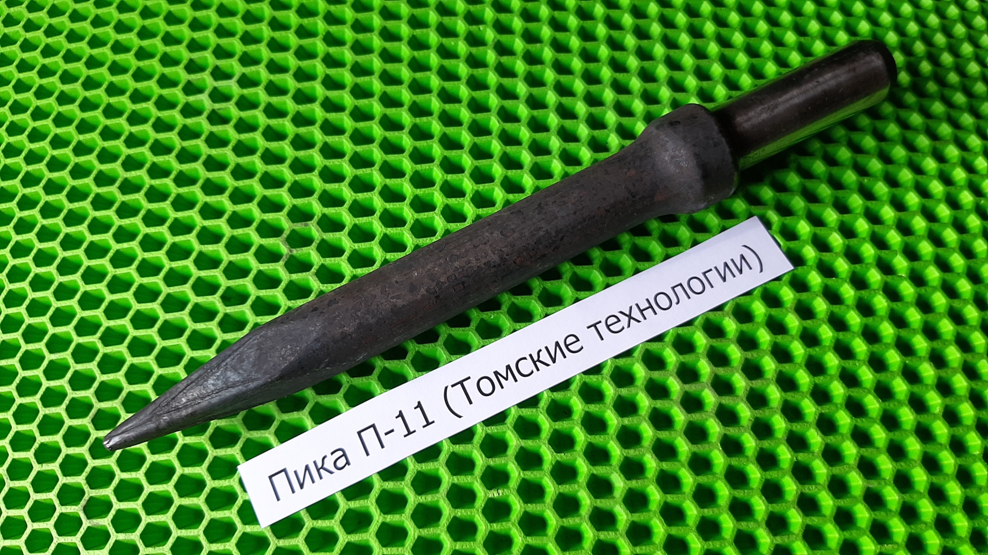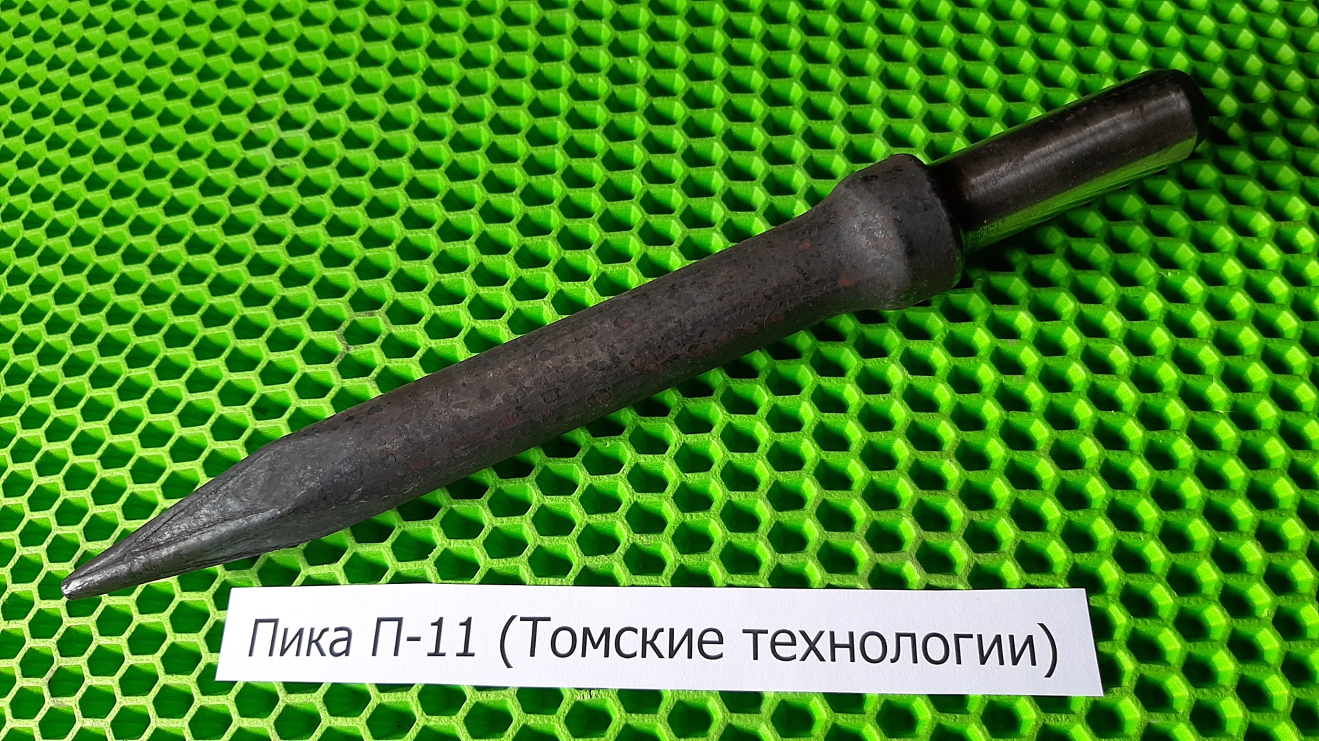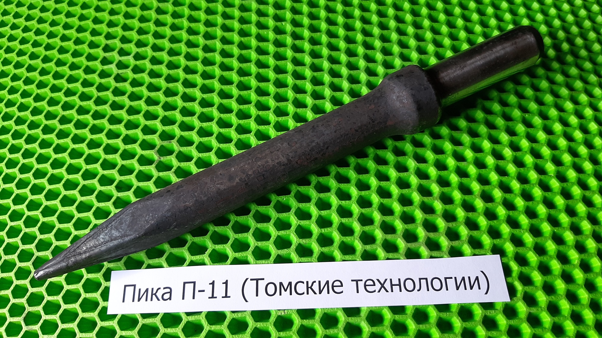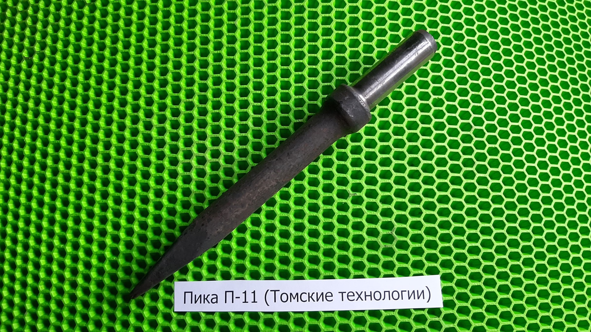 Пика П-11 предназначена для пневматических отбойных молотков типа МО, МОП. Имеет совершенную геометрическую линию, заостренный со всех сторон наконечник имеет форму конуса. Пневматический отбойный молоток МО-4 имеет вес 10 кг, длину 585 мм и рассчитан на применение сжатого воздуха давлением 4 – 5 ат. Молоток МО-4 работает, используя энергию сжатого воздуха, подводимого к нему по резиновому шлангу; ударник молотка под действием сжатого воздуха совершает возвратно-поступательные движения в стволе молотка и наносит удары по хвостовику рабочего инструмента, преобразовывая энергию сжатого воздуха в механическую работу. Пика П-11 к отбойному молотку МО-4 усиленная и изготовлена из стали высокого качества.