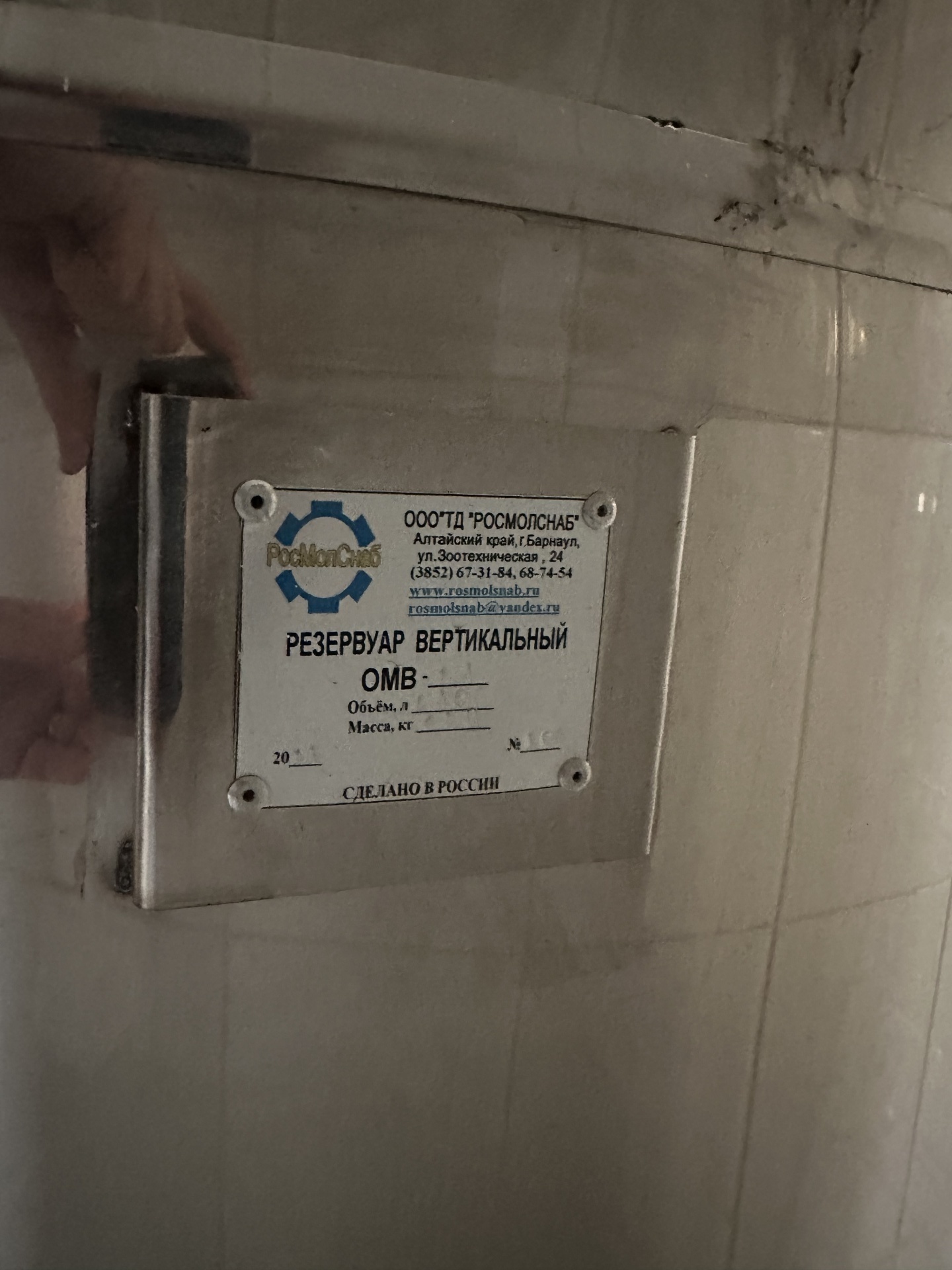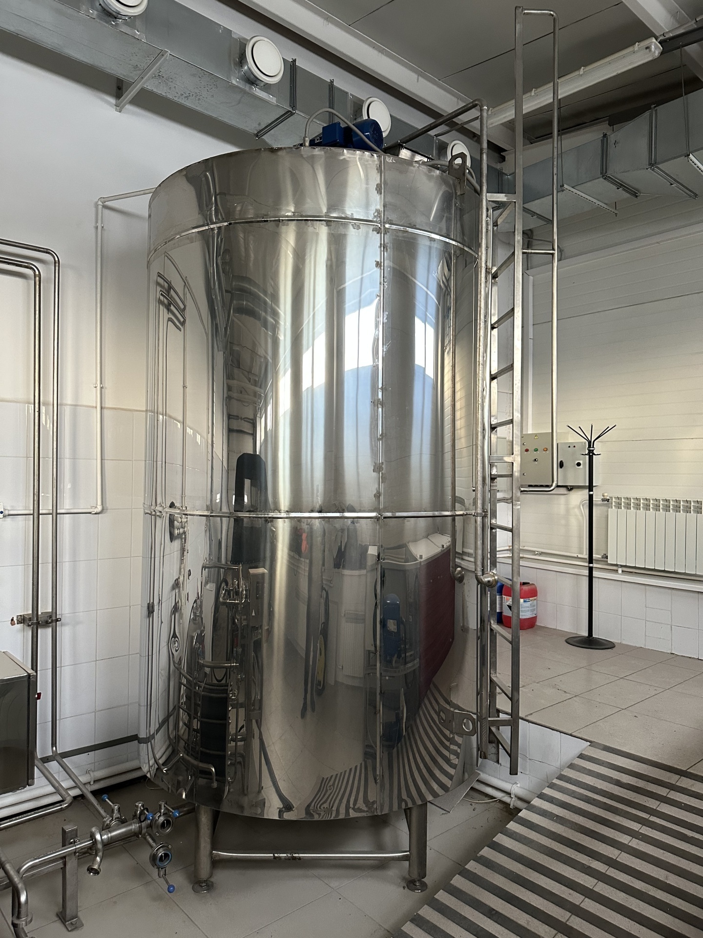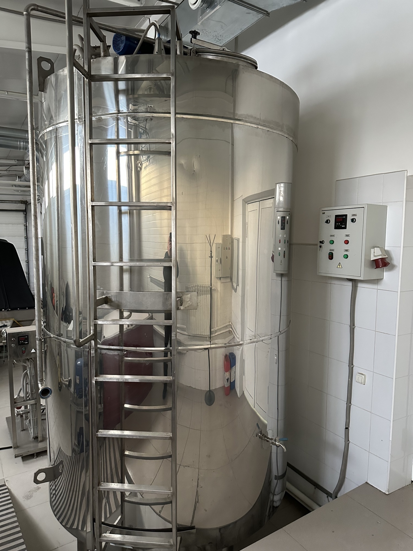 | Емкость с теплоизолирующей рубашкой. Резервуар вертикального типа. Цилиндрический сосуд состоит из внутреннего и наружного корпуса, изготовленного из нержавеющего листа. Пространство между корпусами заполнено термоизоляционным материалом. В верхней части резервуара расположено моечное устройство, воздушный клапан и фонарь подсветки. Резервуар закрытого типа с люком, расположенным сверху. Форма днища – коническое. В нижней части резервуара имеются опоры. Резервуар наполняется через верхний патрубок и освобождается через нижний. Перемешивающее устройство - мешалка рамная. Состояние идеальное. Почти не использовался! |