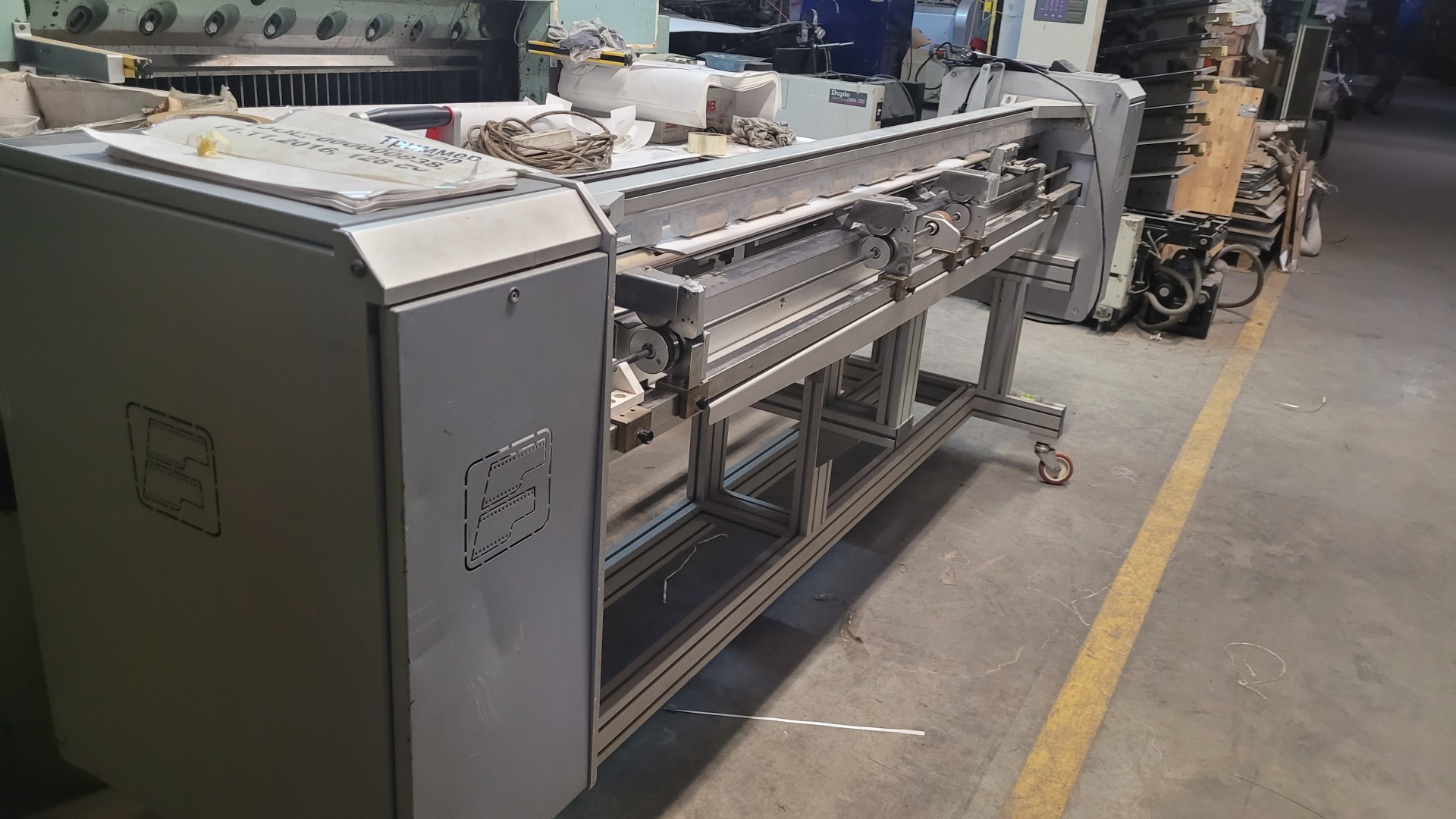 Триммер (резак) цифровой Fotoba XL 190 TJOL. 2007 г.в. Триммер для ровной резки по формату отпечатанных изображений. Автоматически по меткам определяет уход и перекос материала, сам корректирует положение ножей. Одновременно режет по осям X и Y, что позволяет на выходе получать готовое изделие за один цикл, есть нож для разрезки двойников. Ширина реза 1900 мм.