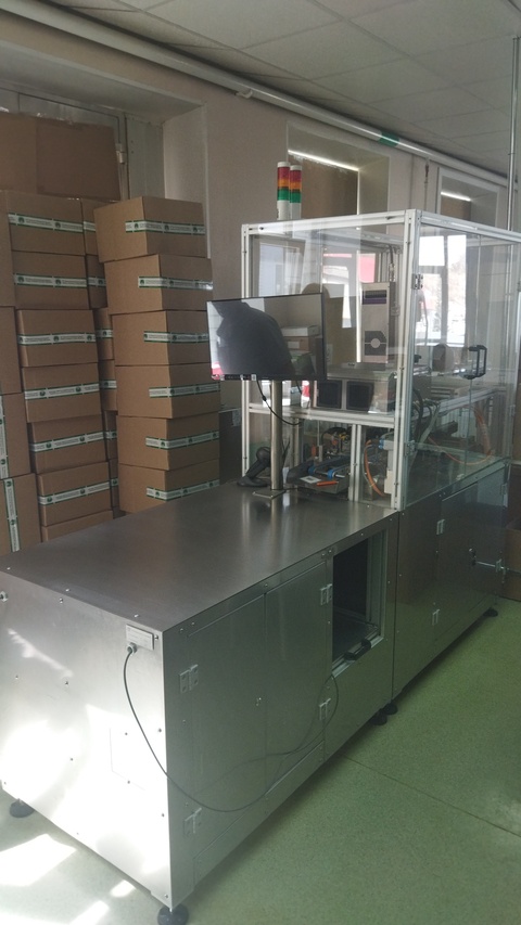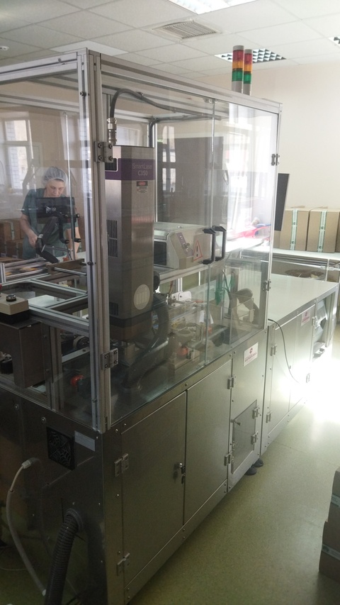 1) Модуль сериализации (принтер Markem-Imaje C 350 bou с контроллером (США), камера оптического зрения Cognex 262 для tracktrace контроля (США) в комплекте с фотодатчиком Omron, узел пневматической отбраковки Festo (Германия) давления 6 бар (200 l/мин), отсек отбраковки из оргстекла с датчиком контроля заполнения, диапазон пачки по ширине конвейера 150 мм.