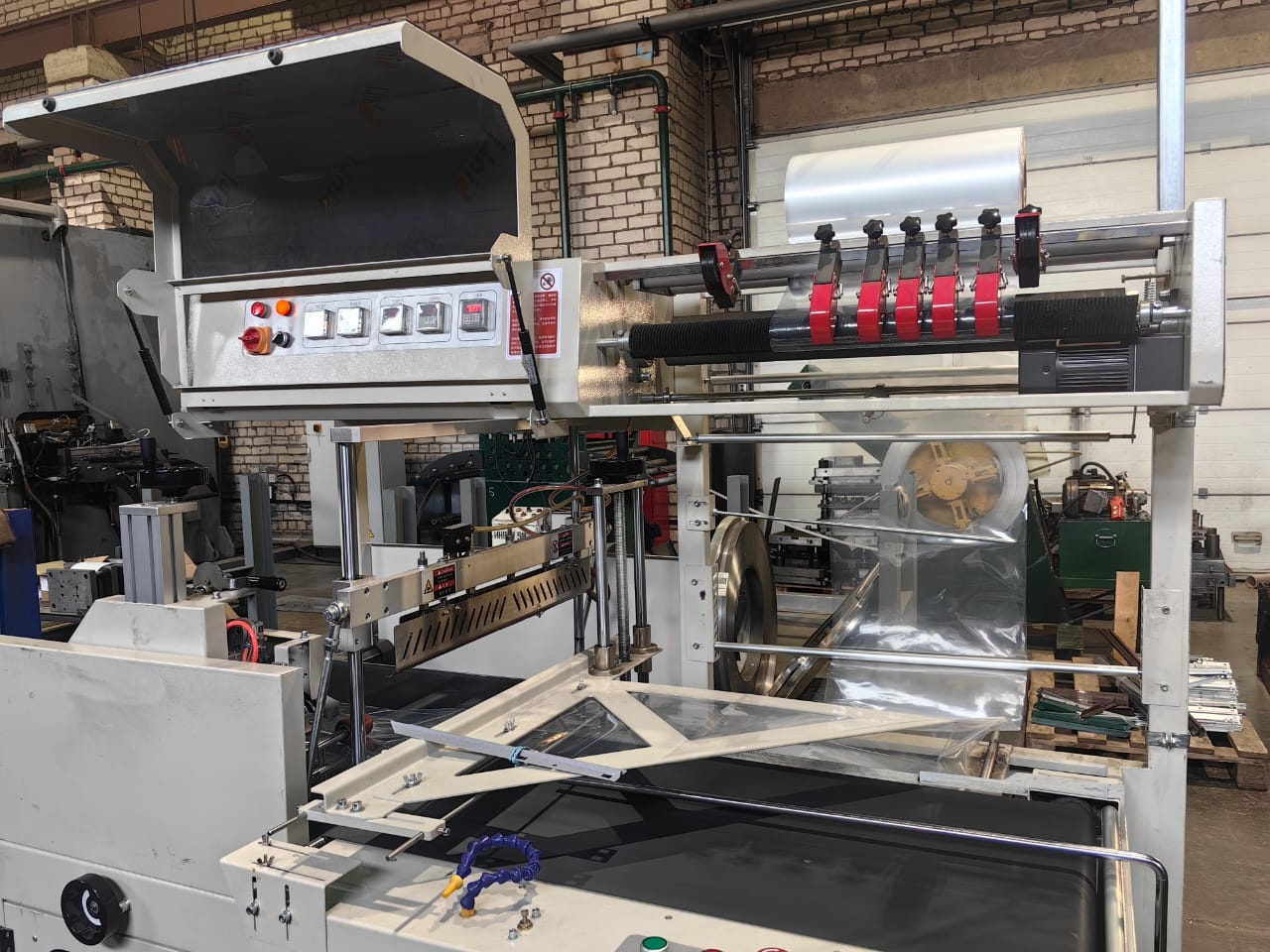 Станок для упаковки в пакеты BF-550 в комплекте с термотуннелем.