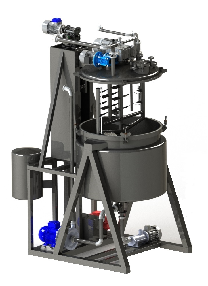 Установка предназначена для производства кремов включает вакуумный эмульгатор и планетарная мешалка. Применяется в пищевой кондитерской промышленности. Установка в своем составе имеет планетарную мешалка, которая представляет рамную мешалку со скребками. Встроенная высоко оборотистая мешалка равномерно смешивает, а встроенный диспергатор создает измельчение и диспергирование продукта. За счет равномерного смешивания и мелкого измельчения при температуре от 65 до 140 гр.С и создания вакуума до 30 mbar получается продукт высокого качества с однородной структурой.