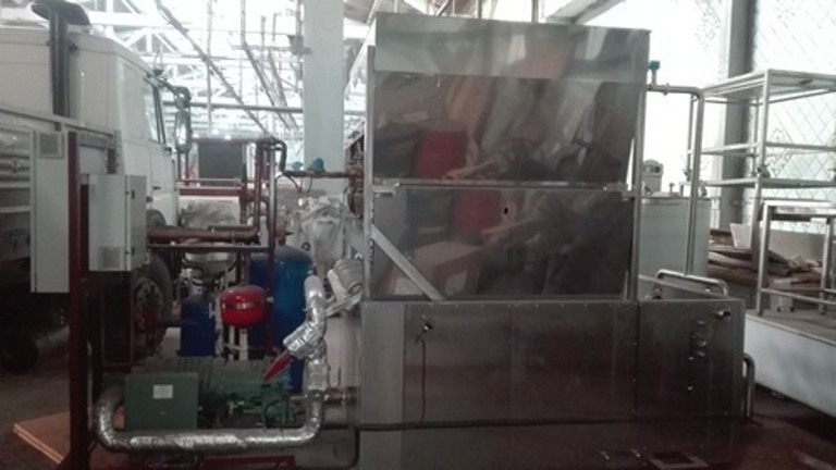 1. Чиллер с плёночным испарителем, применяется для охлаждения жидкости, в которых охлаждение ледяной воды до температур, близких к нулевым, достигается в процессе стекания тонкого слоя ледяной воды по поверхности испарителя. Вода подается в распределительный бак, расположенный над батареей пленочных испарителей. Из распределительного бака вода равномерно подается на вертикально расположенные панели. Тонкий слой воды, стекающей по поверхности панели, образует водяную пленку, и при этом интенсивно охлаждается. Охлажденная вода стекает в бак-аккумулятор чиллера. Затем полностью охлаждённая вода подаётся к потребителям. Температура ледяной воды на выходе из пленочного испарителя колеблется в пределах 0,5 ˚С - 2,0 ˚С. Производительность чиллера 163,6 кВт/час.