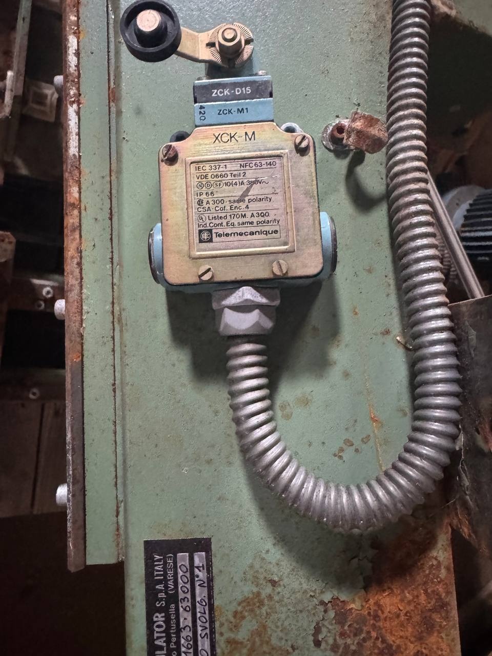 Концевой выключатель (концевик) марки Telemecanique XCK-M, модель головки ZCK-D15 с модулем ZCK-M1. Это промышленный электромеханический выключатель, применяемый для контроля положения подвижных частей оборудования.