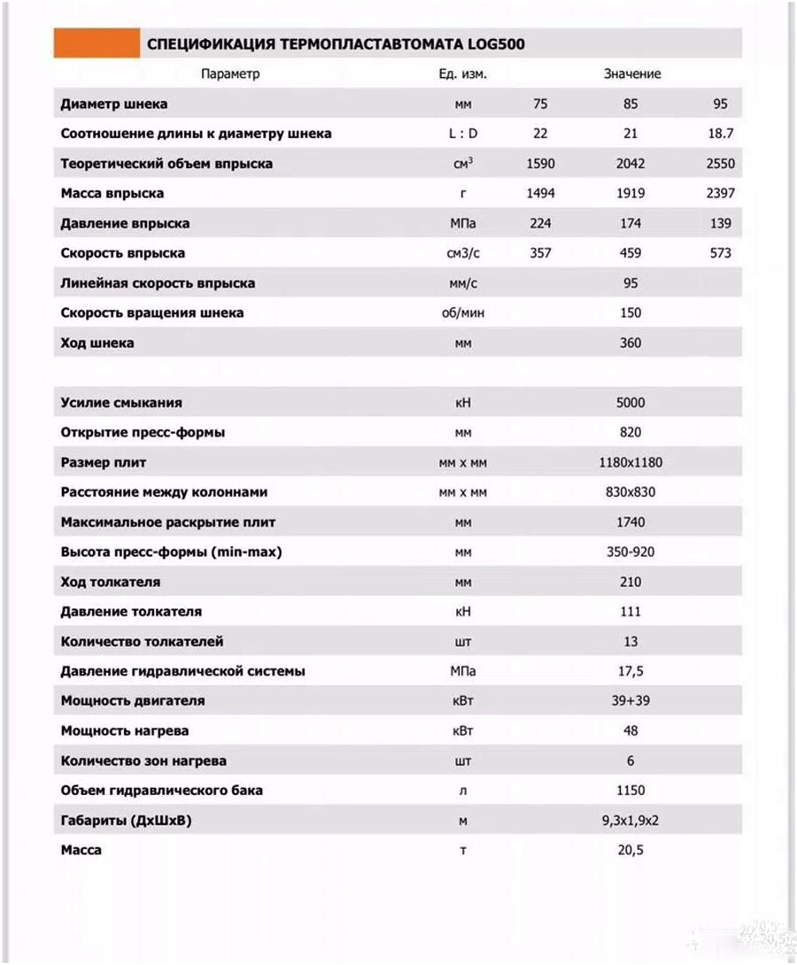 Давление гидравлической системы 17.5 мПа. Мощность насос-мотора 39+39 кВт. Мощность нагрева 48 кВт. Количество зон нагрева 5+1 шт. Время сухого цикла 5.2 с. Объем гидравлического бака 1150 л. Габариты (ДxШxВ) 9.3x1,9х2 м. Вес 20.5т.