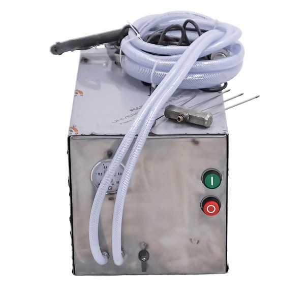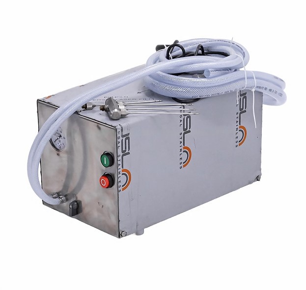 Инъектор для посола типа ФИП марки ФИП-5 (ручной), 460х350х340мм, 220В, 450Вт. Осуществляет посол костного и бескостного мяса говядины, свинины, баранины, конины, оленины, а также мяса птицы и рыбы. В комплект поставки входит итальянский электронасос, два пистолета, заборник рассола с фильтром. Инъектор снабжен регулятором давления и манометром, что позволяет контролировать и регулировать подачу рассола в сырье под давлением от 0.5 до 3-х бар. Иглы взаимозаменяемые, что делает инъектор универсальным. Стандартная комплектация включает два пистолета с 1-й и 3-мя иглами соответственно, каждая игла имеет 6 отверстий, имеет длину 180 мм, диаметр 4 мм. Под заказ можно укомплектовать пистолеты двойными иглами, а также иглами различных диаметров 2,5 мм, 3мм и 4 мм. Работа насоса контролируется защитным автоматом, что делает инъектор безопасным в работе.