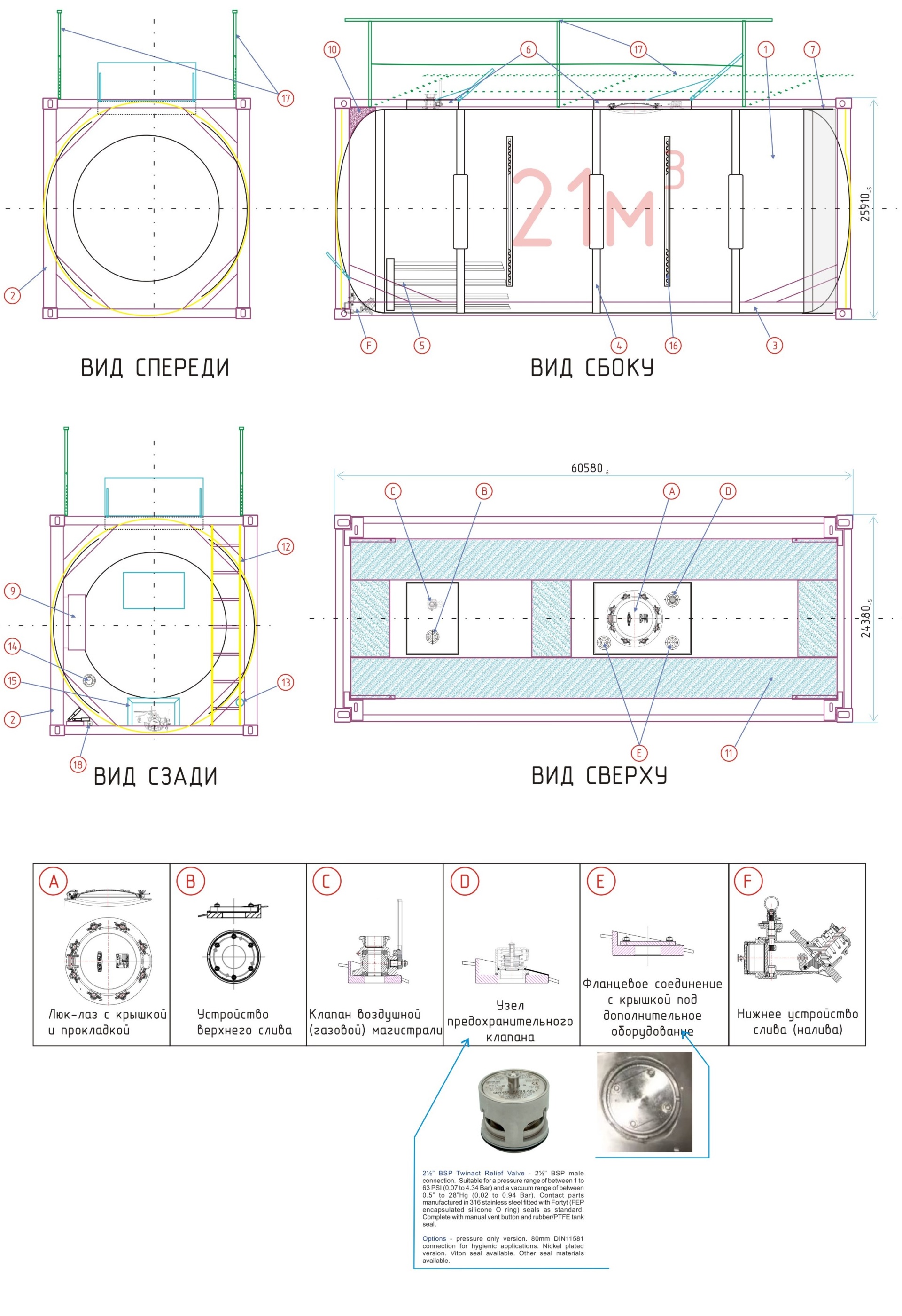 | Фланцевое соединение с крышкой под дополнительное оборудование (поз. E) | Вварной фланец крепления вварен в емкость, расположен горизонтально, с резьбой под предохранительный клапан 2½” BSP Super Maxi relief valve fitted (FV: 01В/16312), с заглушкой. |