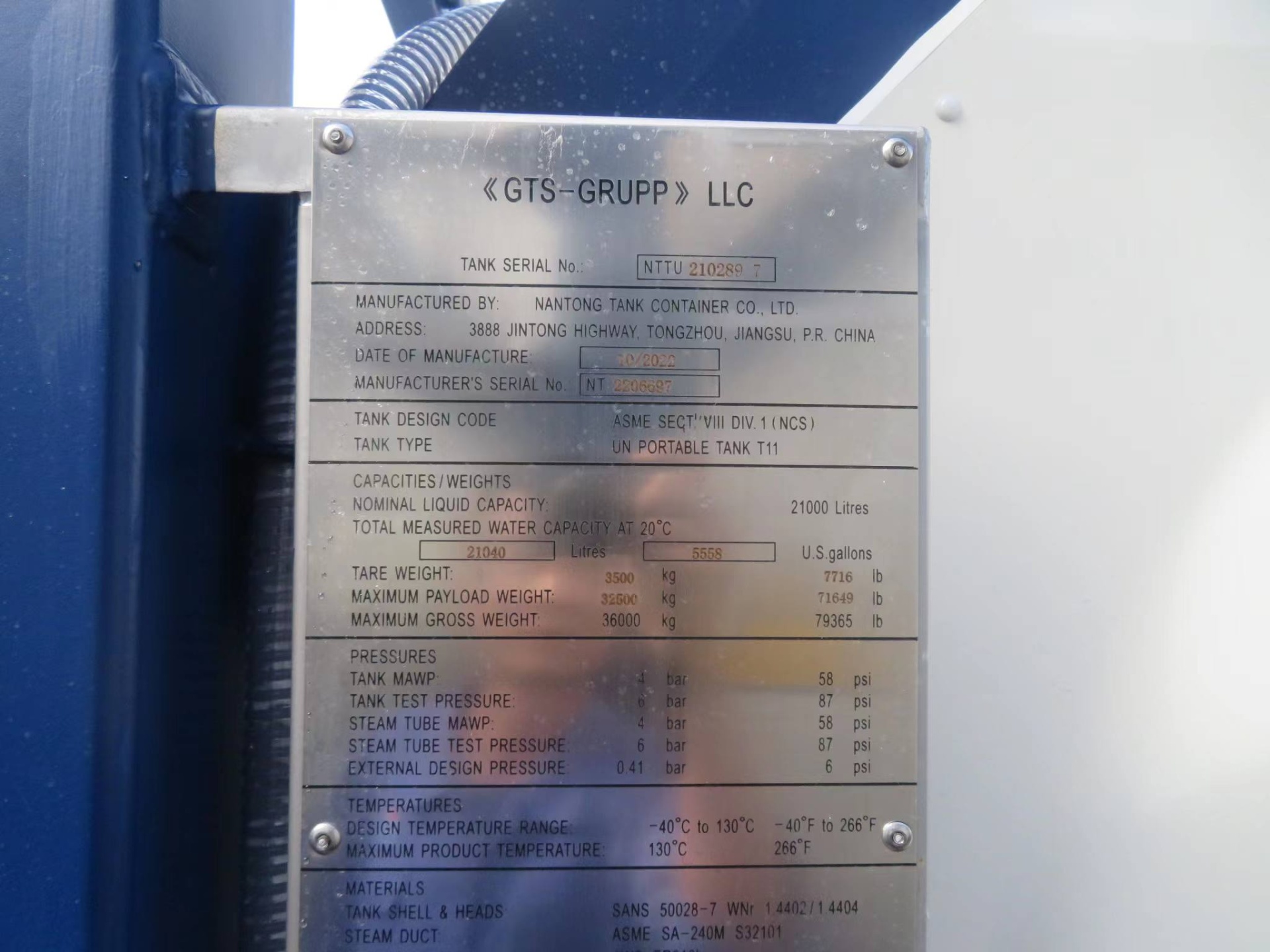 | Материал цистерны | Нержавеющая сталь SANS 50028-7 WNr 1.4402/1.4404 (C<0.03%), эквивалент 316L |