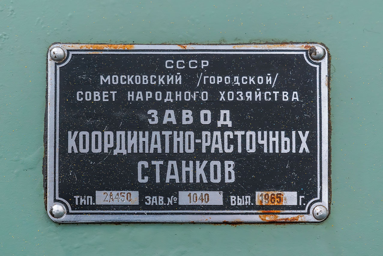 Координатный расточной станок 2А450 предназначен для обработки отверстий с точным расположением осей, расстояние между которыми заданы в прямоугольной системе координат. На станке можно выполнять сверление, чистовое фрезерование, разметку и проверку линейных размеров, например межцентровых расстояний.